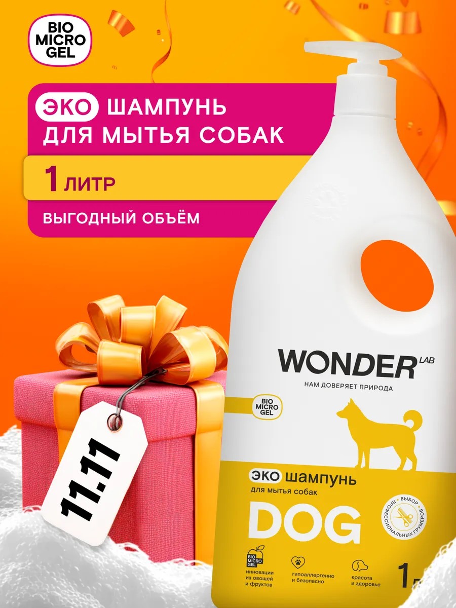 Wonder Lab—an eco-friendly dog shampoo, 1000 ml with a dispenser—is a hypoallergenic product for healthy coat, paws, and skin.