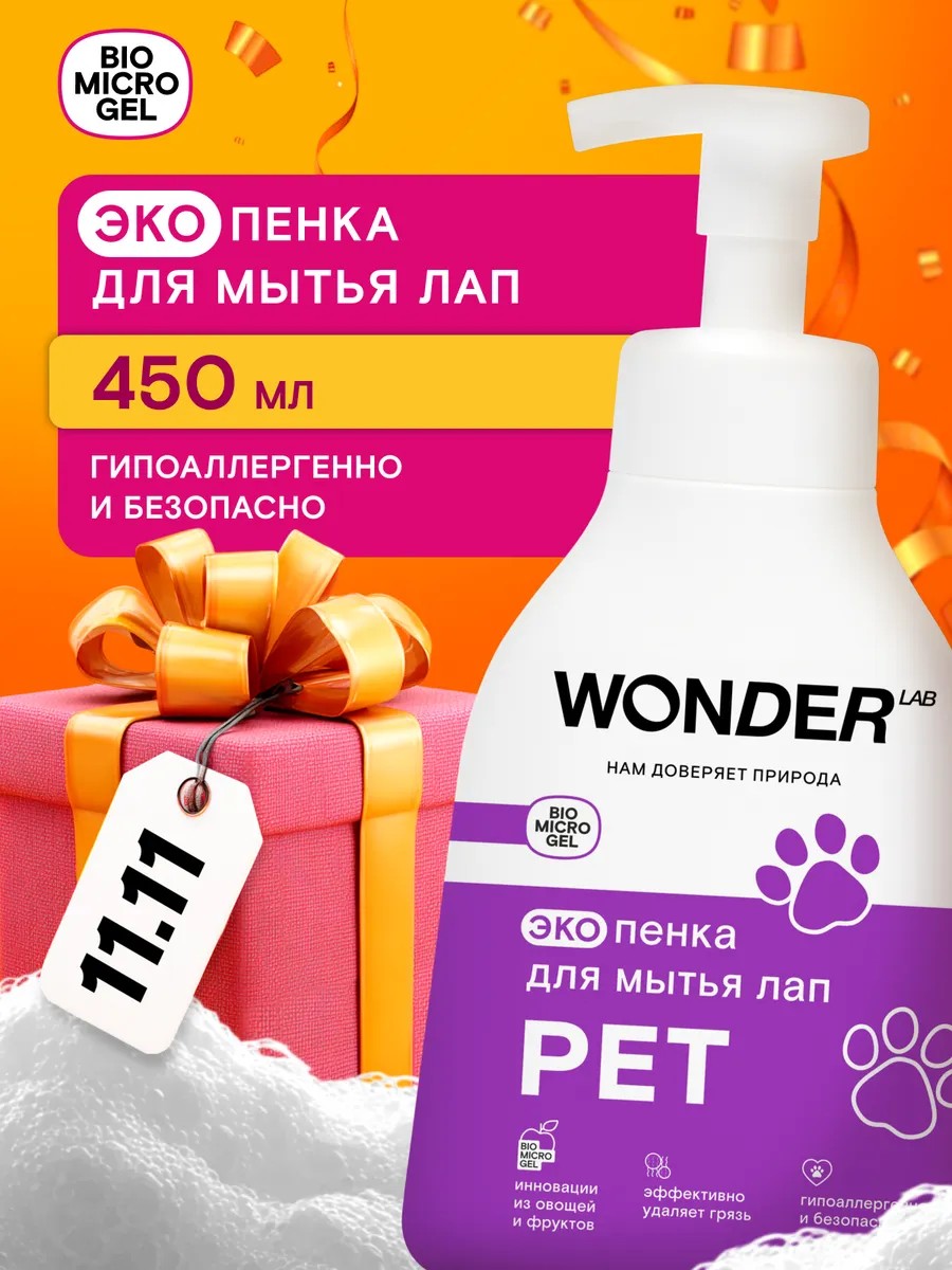 Экологичная пенка для мытья лап животный 450 мл Wonder Lab -мгновенное очищение с помощью экологичной мылопенки. Это уникальное моющее средство на основе Biomicrogel, полученного из овощей и фруктов. Формула действует как шампунь, мыло и очиститель одновременно, быстро удаляя пыль, грязь, следы реагентов и запаха с лап, не пересушивая кожу и шерсть животного.