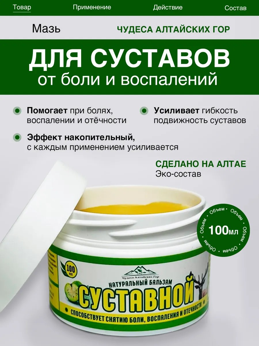 Мазь для суставов – это натуральное средство с Алтая от боли, отеков и воспалений. Бальзам экологичный, с натуральным составом, разработан как часть комплексного ухода, а также как самостоятельное средство для лечения и профилактики сложных суставных и мышечных заболеваний. Уникальная формула средства включает в себя алтайские компоненты, такие как экстракты алтайских трав, кедровая живица, прополис, пихтовое масло, забрусный воск и другие. Благодаря натуральным компонентам и масляной основе, средство проникает глубоко в ткань и работает на уровне мышц и связок.