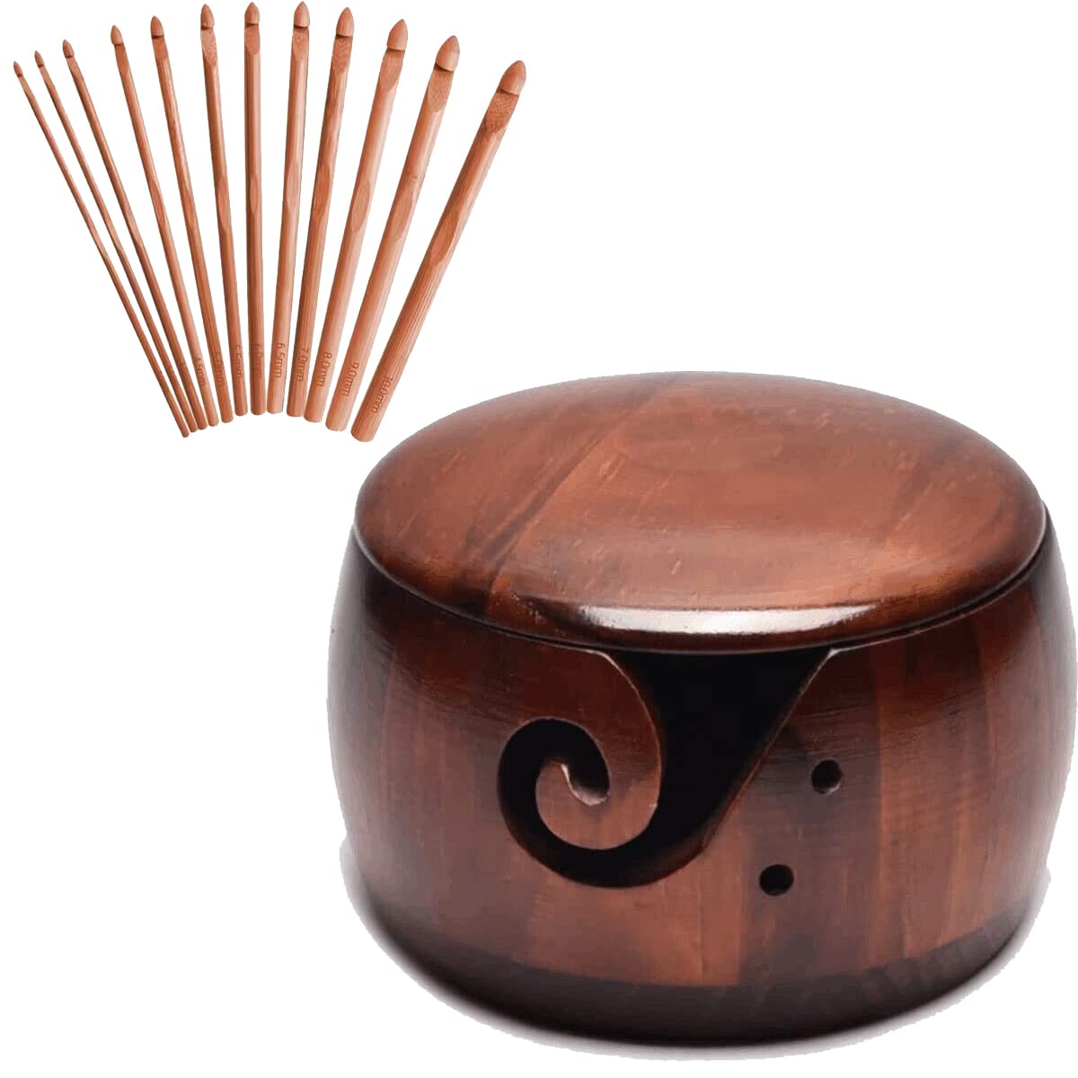 ?OUR Wooden Yarn Bowl is a perfect present for any knitting or crochet enthusiast! Can be easily carried around so that you can knit wherever and whenever you choose. Safer than ceramic alternatives. ?Begin To Enjoying Knitting? Yarn wooden bowls help keep yarn clean, organized, and, most importantly, untangled as you work your way through a project that helps to maintain a proper tension,so the hands and wrists of a knitter have less stress.This allows for more enjoyable knitting and helps to make more uniform stitches. ?Preventing Tangles? Yarn bowl for knitting feature a curled slot and there are 2 small holes on the side of the bowl that captures the yarn as you knit, allowing yarn to be steadily fed through the swirl while preventing tangles.Also are perfect for storing your knitting needles. Hassle-free Purchase?We always remember checking the yarn bowl one by one before shipping to ensure that you will receive a perfect bowl.Of course,if broken problem happens in transit,you can contact us in time and get refunded or a replacement with no reason.Have no risk to try. Perfect Gifts for Knitters?Our yarn crochet bowl holder with exquisite craftsmanship and considerate design is ideal knitting and crocheting accessory, suitable as a practical gift to your mother, grandmother, sister, wife and more knitting lovers to help them improve knitting efficiency.This unique yarn bowl design knitting accessory will be the best gift for knitting lovers such as your mother, daughter,grandma or beloved person.Package Includes:1 x Wooden yarn bowl&&12pcs Crochet Hooks. Carry Anywhere,Anytime? Our handmade wooden yarn storage bowl measures about 5.9''diameter and 3.2'' height,not too big or heavy, won't occupy much space,convenient to put into your bag and carry anywhere;You can also pass your time on the way enjoying the fun from handmade knitting.Lightweight and easy to carry into your tools bags to anywhere and whenver to knit as you like. No More Knots To Worry About?Our knitting crocheting yarn bowl holder is designed with a curled slot that captures the yarn as you knit, allowing yarn to steadily flow through the swirl while preventing entanglement, save much time and effort, improve knitting speeds; There're two holes on the yarn holder bowl for you to store your knitting needles,helping you find them easily when next time use. Quality Material? Our wooden yarn bowls are made from natural log with professionally polished,no burr and pointed part in the yarn outlet,friendly to your skin,will not scratch the yarn and stab your fingers, durable and sturdy, not easy to break or deform,can serve you for long time.