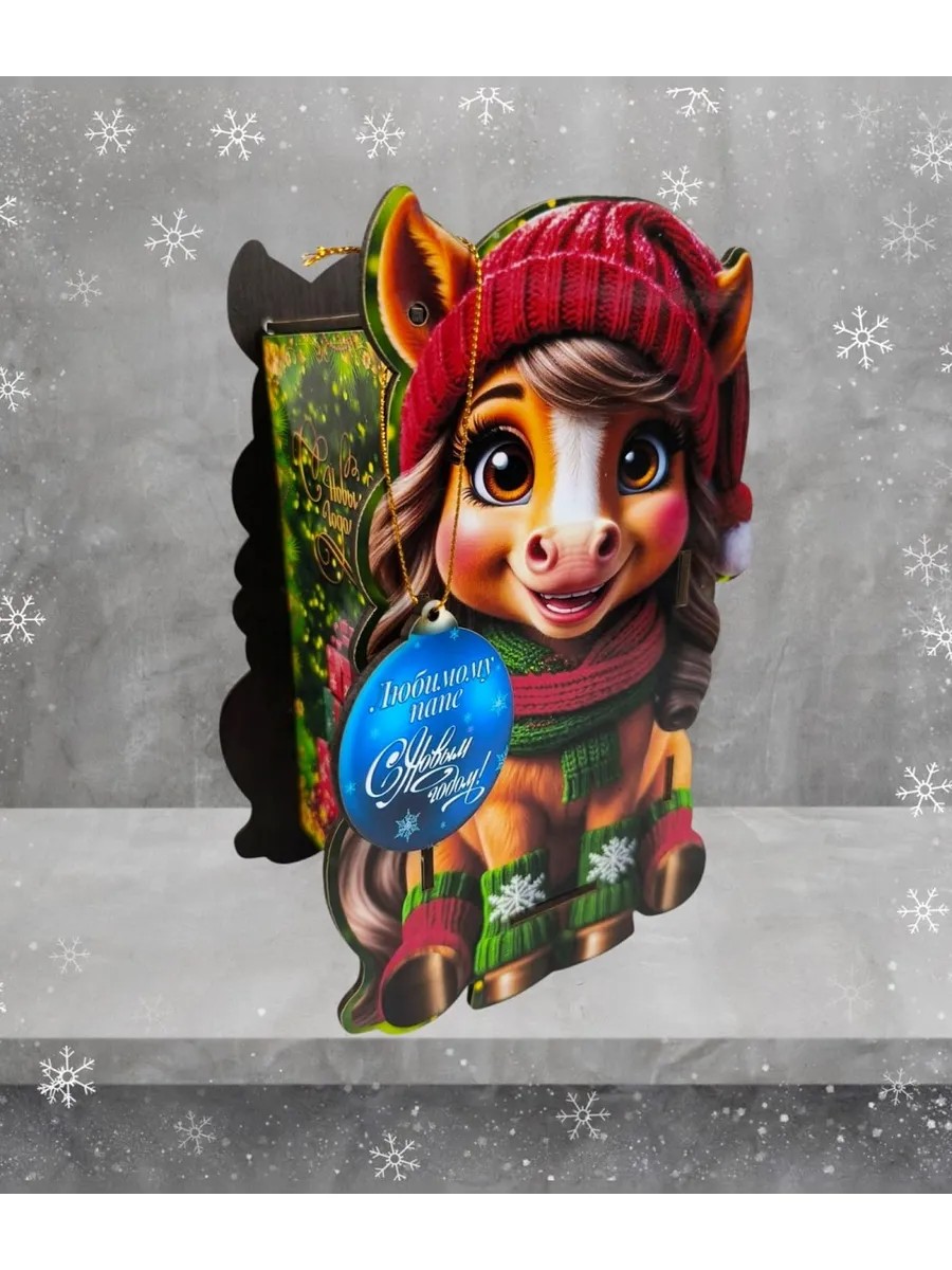 Tea in a New Year's gift box in the shape of a horse with a name tag makes a wonderful gift. It's not for nothing that they say tea is a huge world squeezed into a small cup. Ceylon tea is known and loved in our country, and packaged in a gift box, it makes a wonderful holiday gift for loved ones. The box can also be used for sweet gifts, jewelry, or sewing accessories. Weight with tea: 310 g. Weight of tea: 80 g. Box size: 21 x 14 x 9 cm. Tag size: 5.7 x 6 cm (tag color: green or blue).