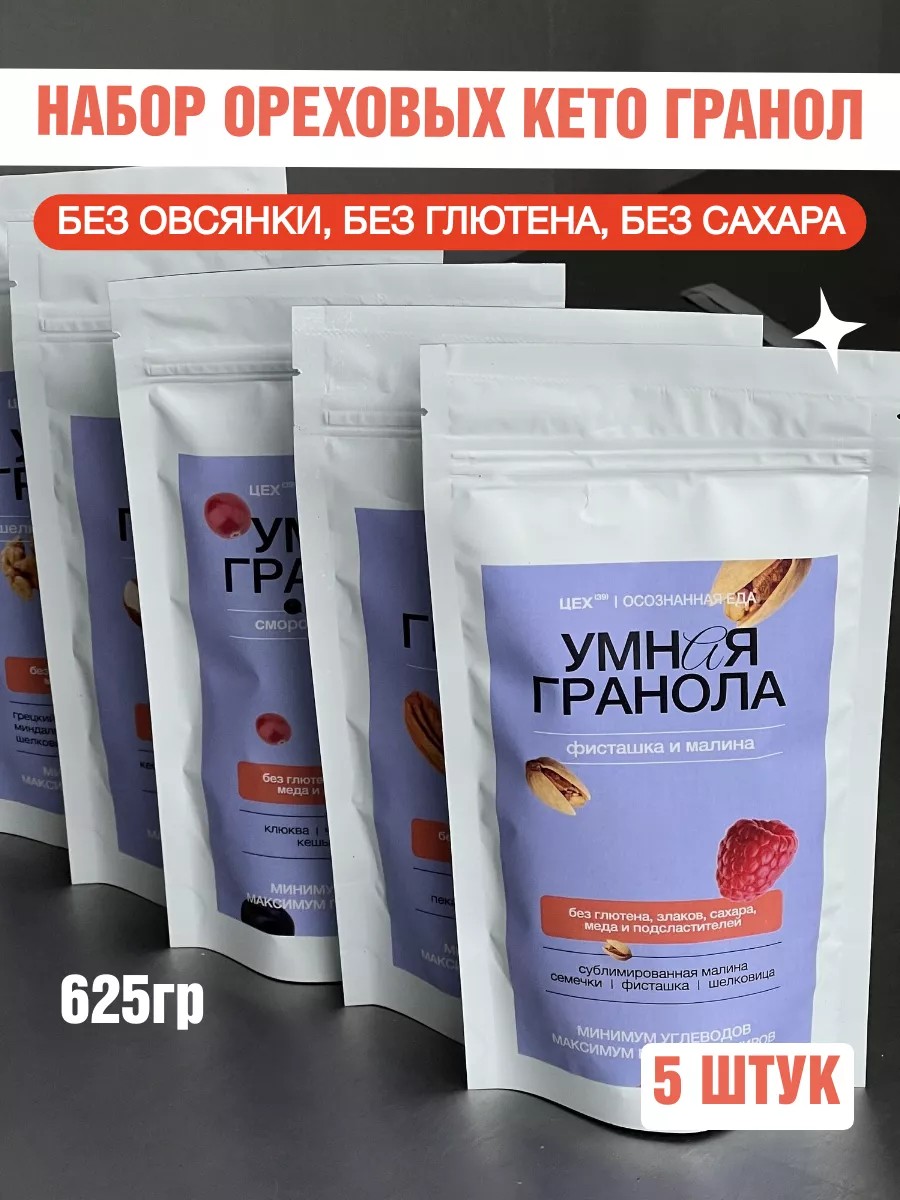'Набор Умных ореховых гранол'- кето продукт, созданный с учетом современного подхода к питанию. Это не мюсли с сахаром, простыми углеводами и сомнительными добавками. 'Умная ореховая гранола' - гранола без сахара, глютена, сиропов, мёда и подсластителей. Овсянку и злаки мы заменили на активированные орехи и семена, дополнив полезными сублимированными ягодами и фруктами, кокосовыми чипсами и интересными добавкими. Умная гранолы – постный продукт, она не содержит продуктов животного происхождения, а ещё консеравантов, ароматизаторов и искусственных добавок. 100% натуральный, низкоуглеводный продукт. Всё в ней отвечает нормам здорового питания: полезные жиры, витамины и минералы, антиоксиданты из сублимированых ягод и фруктов (сублиматы сохраняют практически все полезные свойства свежих ягод и фруктов), качественные, отборные ингредиенты. Состав 'Умной гранолы' сбалансирован: содержит минимум углеводов, растительный белок и полезные жиры. Белково-жировая основа гранолы даёт сытость до 5 часов и позволяет удерживать оптимальный уровень глюкозы в крови! Поэтому порцию ореховой гранолы можно смело включать в ежедневный рацион: дополнять завтрак, использовать как питательный перекус или вкуснейший десерт. Подходит для людей, соблюдающих лечебные протоколы или диеты: КЕТО, БГБКБС, FODMAP, идельна для питания спортсменов, веганов, детей и тех, кто хочет минимизировать потребление глютена и сахара. И да, мы не забыли про вкус! Каждый вкус подарит наслаждение вашим вкусовым рецепторам! Умная гранола - это и полезно, и вкусно.