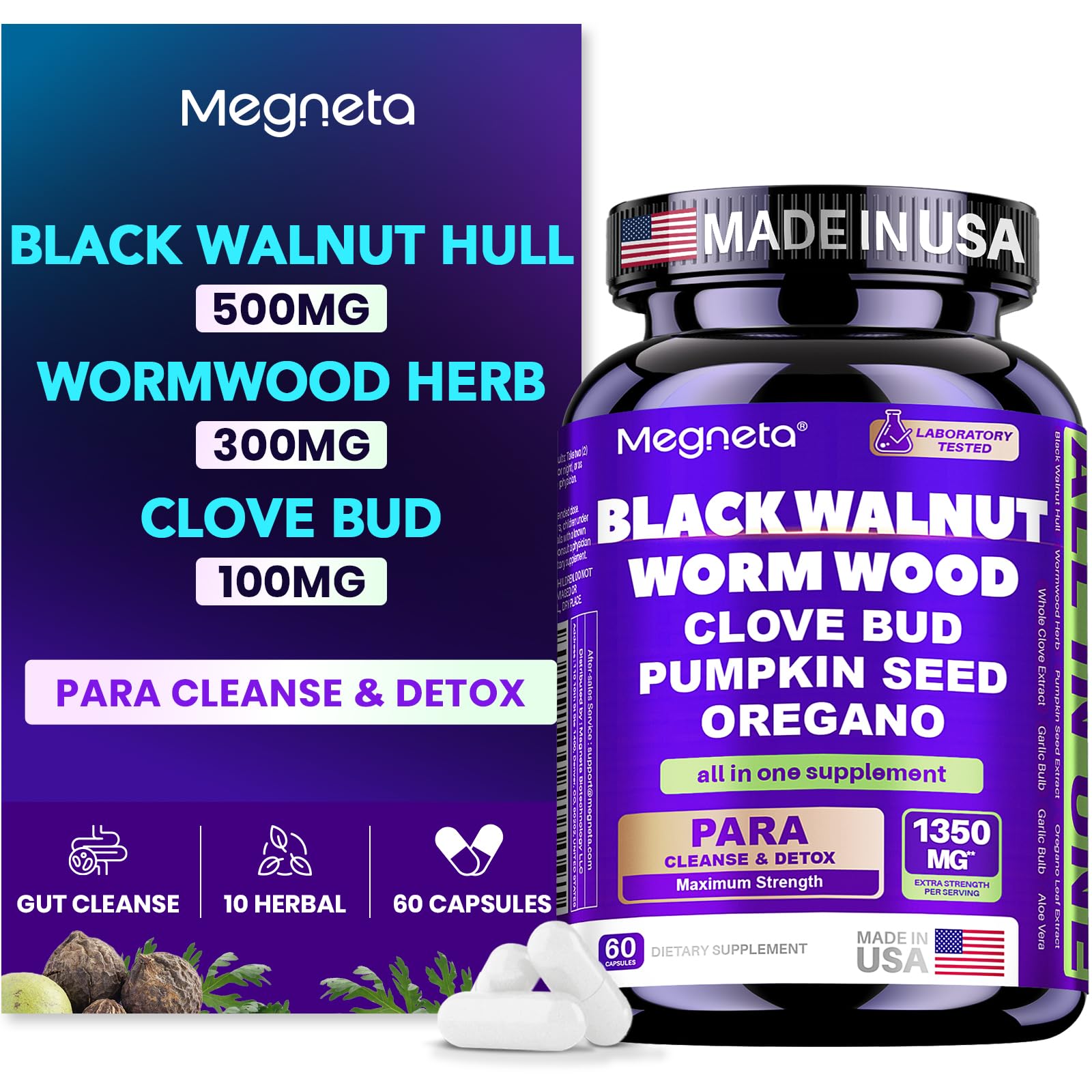 Megneta black walnut, wormwood & clove capsules bottle with herbs and quality icons.