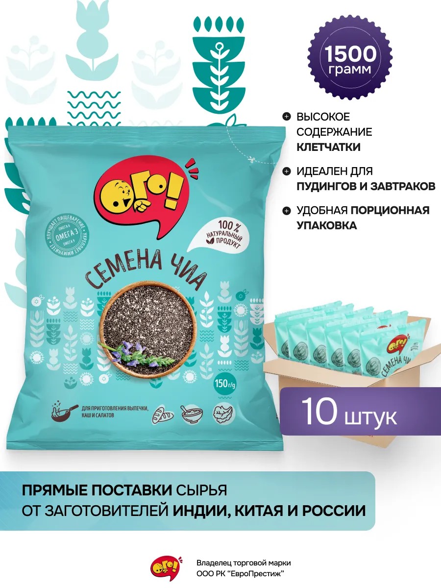 Предлагаем 100% натуральные семена чиа в удобных индивидуальных пакетиках общим весом 1500г. (10 шт. в упаковке). Этот суперфуд - идеальное дополнение к еде для здорового питания и диеты!