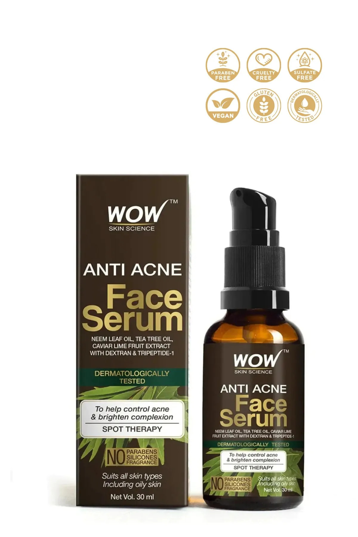 • Help your skin fight acne flare-ups and glow with WOW Skin Science Anti-Acne Facial Serum. This highly active, concentrated serum offers the benefits of Neem Leaf Oil, which purifies and protects skin Tea Tree Oil, which balances sebum Caviar Lime Fruit Extract, an AHA that exfoliates and brightens skin and Dextran (and) Tripeptide-1, skin-renewing actives that stimulate collagen and improve skin elasticity. The serum helps reduce acne, fade scars and blemishes. It soothes redness and skin irritation. It helps purify skin and minimize pores. The peptides in the serum repair skin and increase collagen and elastin production.