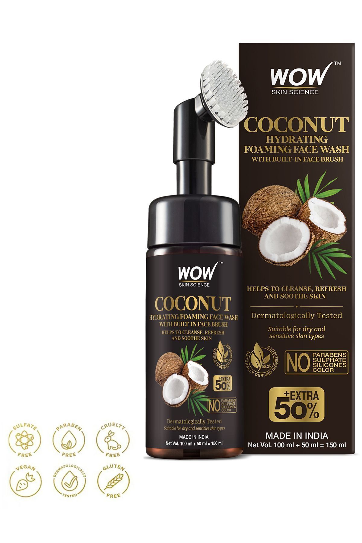 WOW Skin Science Coconut Moisturizing Face Wash Foam&Built-in Purifying Polisher- 3NATURAL INGREDIENTS