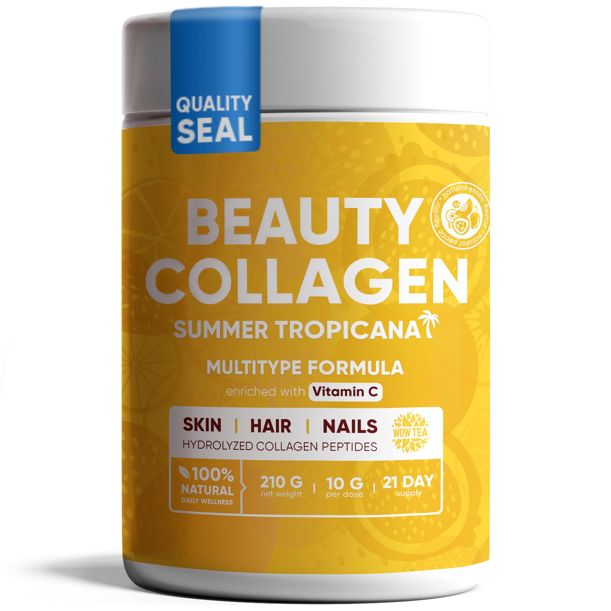 Experience the beautifying power of collagen peptides and vitamin CImprove your skin, nails and hair.Sentez le pouvoir embellissant des peptides de collagène et de la vitamine CAméliorez votre peau, vos ongles et vos cheveux.WOW TEA: Collagène Summer Tropicana