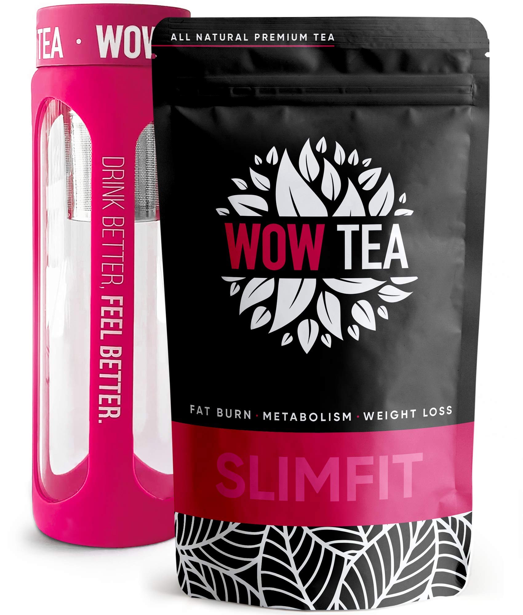 WOW TEA Thés détox pour perdre du poids : thé détox Slim Fit T Mélanges de tisanes pour cure de désintoxication et perte de poids du thé vert, maté, pu-erh infuseur 150 g, fabriqué en UE SlimFit Bouteille à thé rose