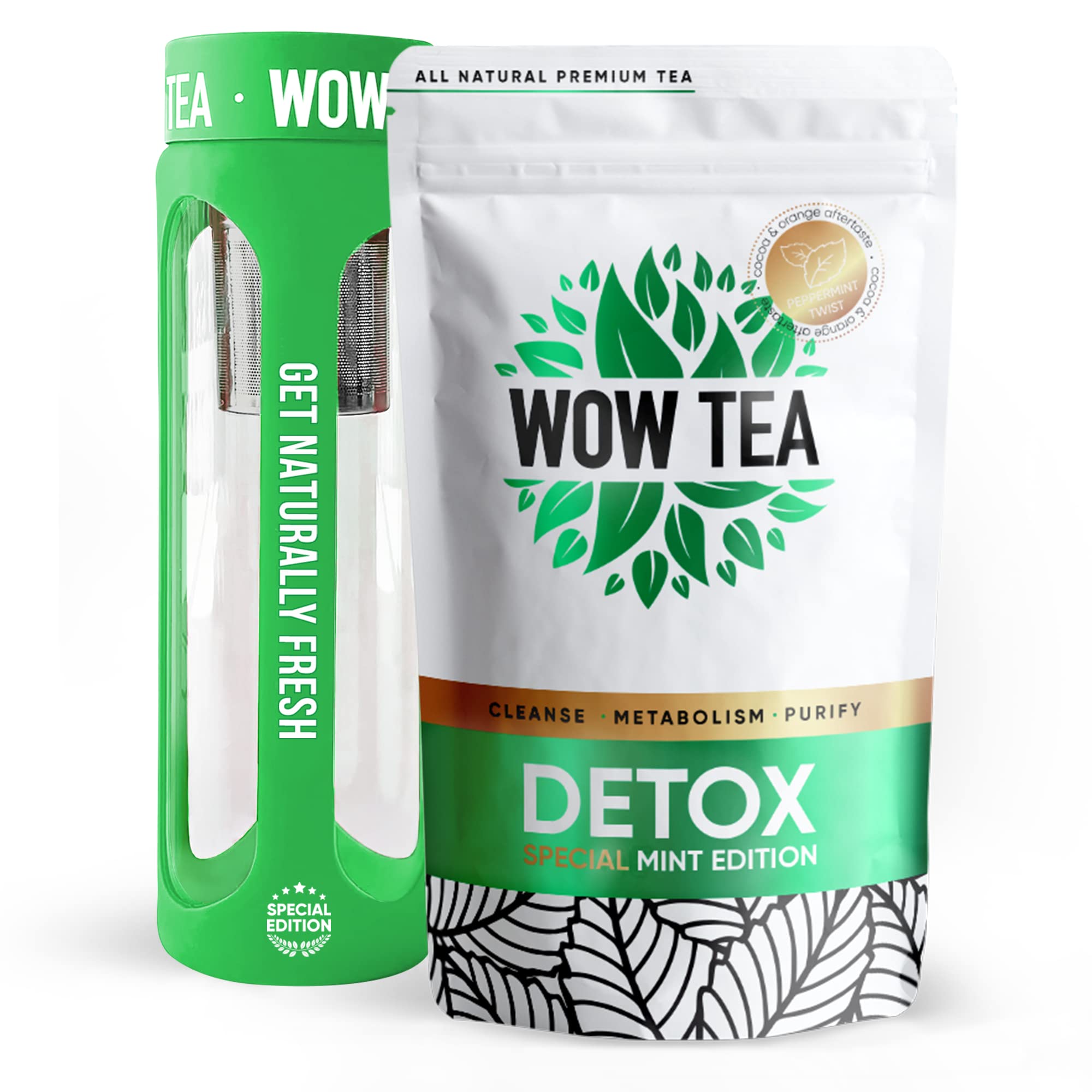 Comes with a free emailed meal plan – Professionally created. Support your whole-body transformation journey. Over 25 recipes for healthy eating and detoxing. CRISPY GREEN INFUSER BOTTLE – The limited-edition WOW TEA bottle helps extract the maximum amount of herbs and deliver the richest flavor. Plus, glass bottles are a small but significant step for the environment compared to disposable plastic bottles. Weight Management Support – With a precise complex of active herbs selected from different parts of the world, WOW Teas in the Mint Edition support weight management and keep the body in shape naturally. Gut Health Support and Reduced Bleeding – The two mint-enriched formulas help reduce water retention and bloating while aiding digestion and bowel function. Optimizing the body's metabolic processes – To facilitate natural weight management, WOW TEA mint teas help stimulate metabolic functions, normalize digestion, and promote better food processing. 100 natural ingredients and delicious taste – The limited edition WOW TEA Mint range consists of two teas based on the original recipes, enriched with an additional classic herb and the rich taste of cocoa beans and exotic bergamot.