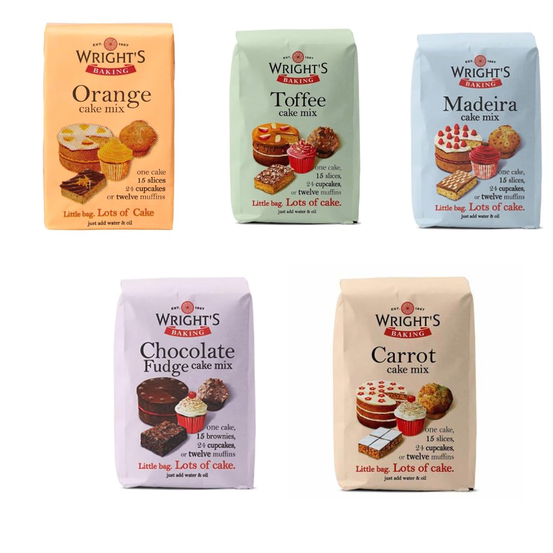 Wright's Baking Cake Mix Selection Pack - Carrot Madeira Toffee Chocolate Fudge & Orange (One of Each 500g Pack) | can be used to bake light & moist cakes slices muffins or cupcakes