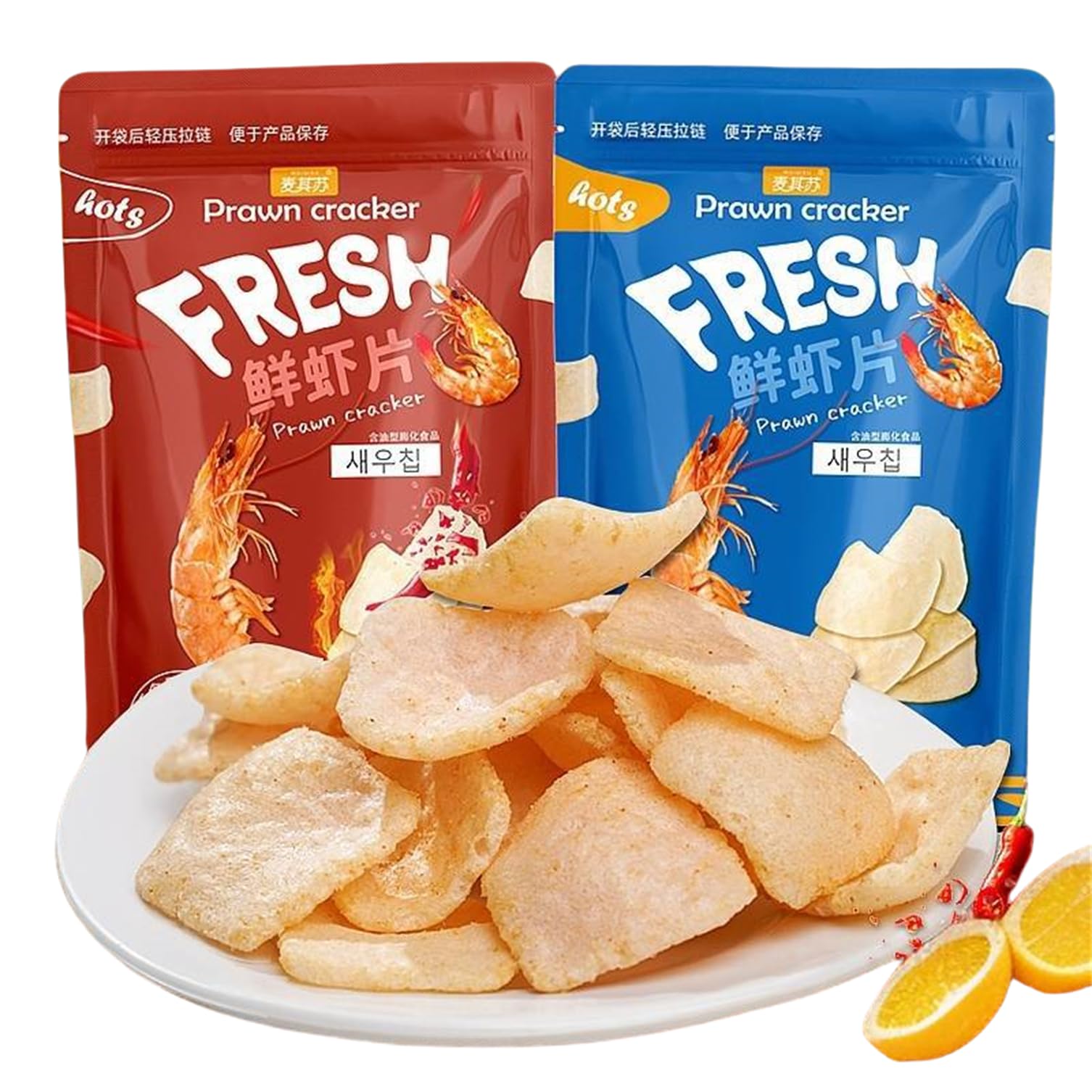Using fresh shrimp as our raw material, and combining traditional know-how with modern technology, we create a classic snack with a golden, crispy texture and a rich shrimp flavor. Suitable for all ages, whether as a snack while watching TV series, sharing at parties, or pairing with meals, it can provide the ultimate delicious experience. Product Name: Fresh Shrimp Chips, Original and Spicy Flavors Allergen Information: Cereals and their products containing gluten, and shrimp and their products Production Date: See packaging (packaging indicates the product's production date) Package Size: 168 g Shelf Life: 270 days Storage Conditions: Store in a cool, dry place INGREDIENTS Shrimp Chips