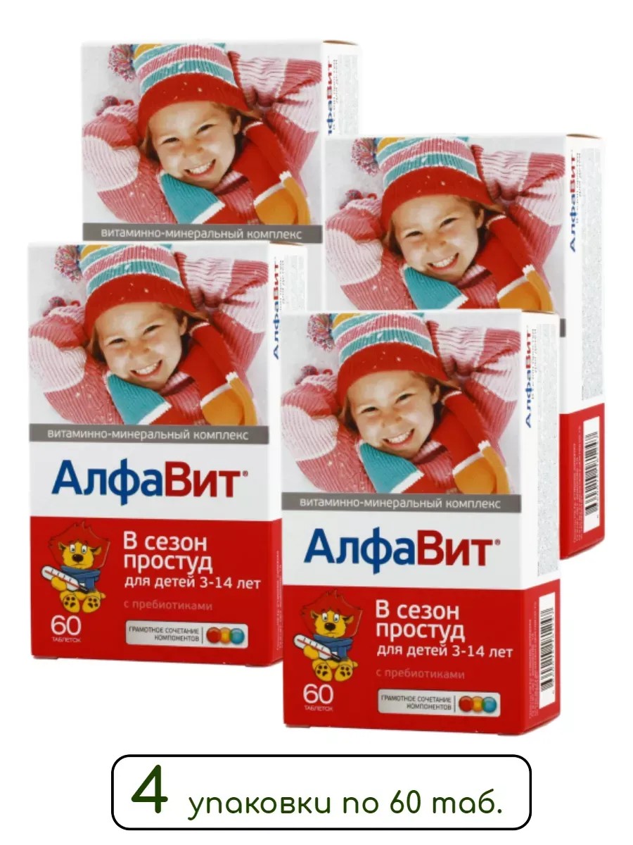 Алфавит В Сезон Простуды для детей - это комплексная формула для поддержки иммунитета и профилактики ОРВИ у детей. Препарат содержит 11 важнейших витаминов, 8 минералов и микроэлементов, а также экстракты иммуномодулирующих трав. Особенностью данного продукта являются жевательные таблетки со вкусом клубники, которые легко принимать детям. Курс 1 месяц (60 таблеток) поможет поддерживать иммунную систему на оптимальном уровне для борьбы со всякой зимней инфекцией. Витаминно-минеральный комплекс АЛФАВИТ В сезон простуд для детей укрепит защитные силы организма и поможет противостоять «атакам» вирусов и бактерий. Комплекс включает в себя все необходимые ребенку витамины и минералы, в том числе те, которые требуются для иммунной системы, а также содержит компоненты, нормализующие микрофлору кишечника – пребиотики. От состояния микрофлоры кишечника во многом зависит устойчивость организма к различным инфекциям: полезные лакто- и бифидобактерии не позволяют размножаться болезнетворным микроорганизмам.Компоненты АЛФАВИТА В сезон простуд для детей:-укрепляют иммунитет;-снижают риск инфекционных заболеваний;-восстанавливают (в том числе после болезни) естественную защиту организма;-способствуют нормализации микрофлоры кишечника, в том числе после приема антибиотиков;-облегчают течение и уменьшают число рецидивов инфекционно-воспалительных заболеваний.Витаминно-минеральные комплексы предназначены для профилактики, а не для лечения. Поэтому вы сами можете определить длительность витаминной профилактики у вашего ребенка. Например, в сезон простуд ребенок может принимать витамины в течение 1 месяца, затем сделать перерыв на 10–15 дней и снова повторить курсжевательные таблетки розового цвета, оранжевого цвета, белого цвета.РЕКОМЕНДАЦИИ ПО ПРИМЕНЕНИЮ:Детям старше 3 лет по 1 таблетке одного из видов в день во время еды за завтраком, обедом и ужином в любой последовательности. Продолжительность приема - 1 месяц.