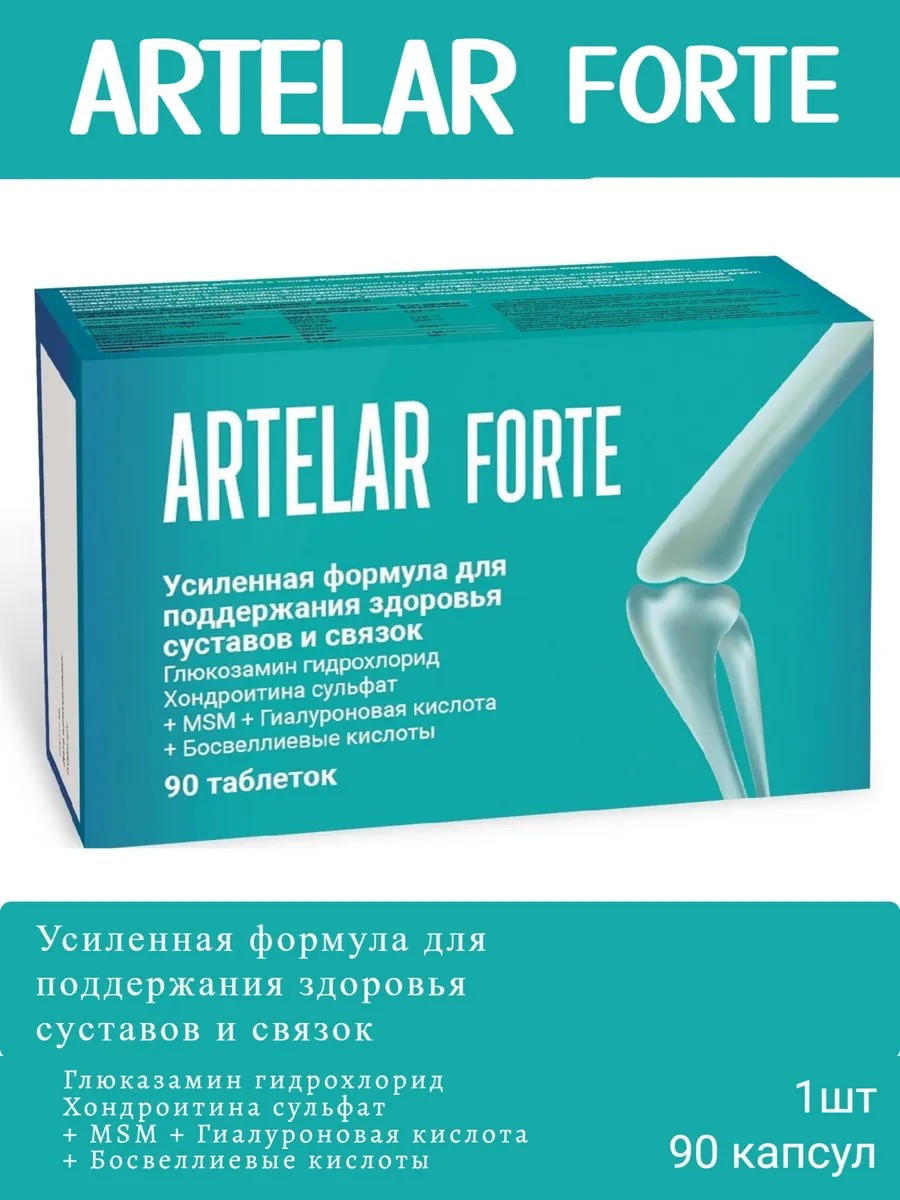 Купить Артелар Форте для суставов с глюкозамином, хондроитином, МСМ, гиалуроновой кислотой и экстрактом босвеллии – эффективный комплекс для восстановления хрящевой ткани, уменьшения боли и воспаления. Подходит при артрозе, артрите, остеохондрозе, а также для профилактики возрастных изменений. Улучшает подвижность суставов, стимулирует синтез коллагена, защищает от разрушения. 90 таблеток в упаковке, курс 1-3 месяца.те