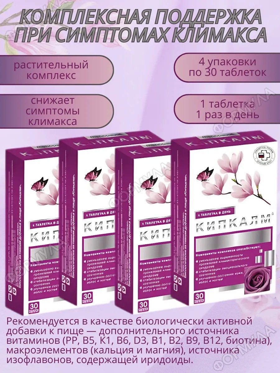 Продукт на основе натуральных компонентов, которые способствуют снижению выраженности симптомов переходного периода у женщин, таких как приливы, потливость, озноб, учащённое сердцебиение, перепады настроения, учащённое мочеиспускание и утомляемость.