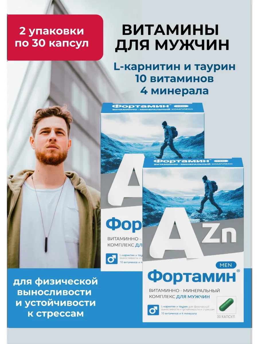 Мужские витамины Фортамин для мужчин - комплекс витаминов "от А до Цинка", мультивитамины (поливитамины) для мужчин, содержит группы необходимые витамины и минералы. Добавки для здоровья укрепят иммунитет. Для спортсменов, для людей ведущих здоровый образ жизни, бады с натуральным минеральным составом. Ежедневный прием пищевой добавки способствует повышению сопротивляемости организма инфекциям, выведению токсинов, укреплению костной ткани, улучшению состояния кожи. Мультивитамины помогут укрепить иммунитет, повысить уровень энергии и выносливости. Они не только полезны для спортсменов, но и для всех, кто стремится к здоровью и активной жизни. Прием витамин и бадов для потенции мужчин увеличивает возможность зачатия и рождения здорового ребенка. Кроме того добавка поможет замедлить процессы старения, укрепить ногти. Многие покупатели отмечают, что бад стимулирует рост волос. L-Карнитин повышает физическую и умственную работоспособность, повышает выносливость во время физических нагрузок и улучшает восстановление после них. Является ценным элементом для мужского здоровья, т к содержится в семенной жидкости. Употребление L-карнитина положительно сказывается на количестве сперматозоидов и их подвижности, способствуя улучшению качества. L-карнитин улучшает эрекцию и поддерживает стабильную потенцию. L-Таурин способствует нейтрализации, связыванию и удалению из организма токсинов. Благодаря своим антиоксидантным свойствам защищает ткани сердца от повреждения свободными радикалами, поддерживает здоровье глаз. Участвует в регуляции углеводного обмена и способствует снижению уровня сахара в крови. Таурин тормозит увеличение концентрации холестерина в крови. Аскорбиновая кислота (витамин С). Мощный антиоксидант, повышает сопротивляемость организма различным инфекциям, способствует повышению эластичности кровеносных сосудов. Витамин С ответственен за синтез коллагена и восстановление (а значит, и рост) мышц, за усвоение минералов и поддержание здорового уровня тестостерона и других гормонов. Витамин Е Антиоксидант, стимулирует иммунную систему; способствует нормализации уровня холестерина в крови и поддержанию нормального состояния сердечно-сосудистой системы и репродуктивного здоровья. Цинк Способствует повышению концентрации и подвижности сперматозоидов, стимулирует активность половых гормонов. Укрепляет иммунитет, улучшает состояние кожи и волос. При дефиците цинка начинает беспокоить избыточная потеря волос, медленный рост в длину, ухудшение качества волос (сухость, сечение, ломкость). Недостаток цинка может провоцировать раннее поседение волос. Селен повышает сопротивляемость организма вирусам и бактериям. Благоприятно влияет на обменные процессы, способствует нормализации деятельности нервной и эндокринной систем, в образовании и созревании сперматозоидов.
