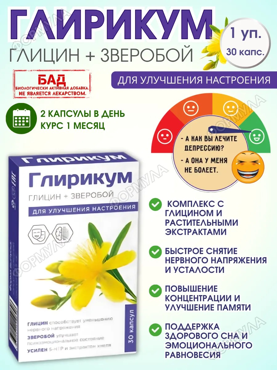 | Полное наименование товара | Глирикум+Зверобой капсулы 30 шт, натуральная поддержка нервной системы, улучшение сна и настроения |