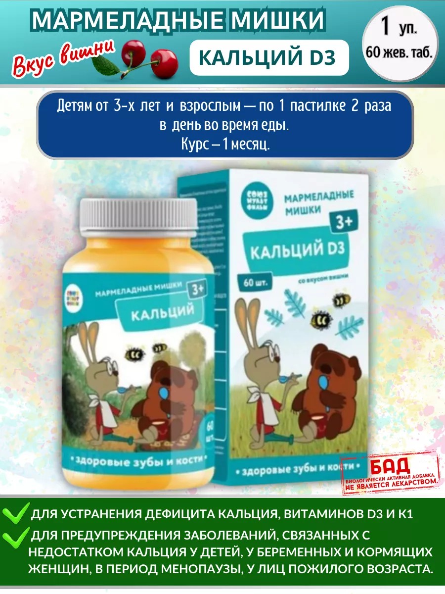 Мармеладные мишки Кальций - это идеальное дополнение к рациону вашего ребенка. Содержащие витамины D3 и К1, а также необходимый кальций, они способствуют укреплению костной ткани и зубов. Витамин D3 облегчает усвоение кальция и регулирует его распределение в организме, а витамин К1 повышает свертываемость крови и защищает клетки костно-суставной системы от воспаления. Этот комплекс рекомендуется для устранения дефицита кальция и витаминов D3 и К1. Он идеален для детей, беременных и кормящих женщин, лиц пожилого возраста и тех, кто находится в период менопаузы. Улучшите здоровье своего ребенка с мармеладными мишками Кальций. Принимать детям от 3 лет и взрослым по 1 пастилке 2 раза в день во время еды. Продолжительность приема — 1 месяц. При необходимости прием можно повторить.