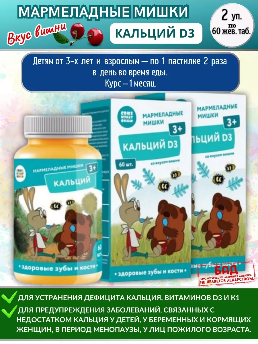 Мармеладные мишки Кальций - это идеальное дополнение к рациону вашего ребенка. Содержащие витамины D3 и К1, а также необходимый кальций, они способствуют укреплению костной ткани и зубов. Витамин D3 облегчает усвоение кальция и регулирует его распределение в организме, а витамин К1 повышает свертываемость крови и защищает клетки костно-суставной системы от воспаления. Этот комплекс рекомендуется для устранения дефицита кальция и витаминов D3 и К1. Он идеален для детей, беременных и кормящих женщин, лиц пожилого возраста и тех, кто находится в период менопаузы. Улучшите здоровье своего ребенка с мармеладными мишками Кальций. Принимать детям от 3 лет и взрослым по 1 пастилке 2 раза в день во время еды. Продолжительность приема — 1 месяц. При необходимости прием можно повторить.