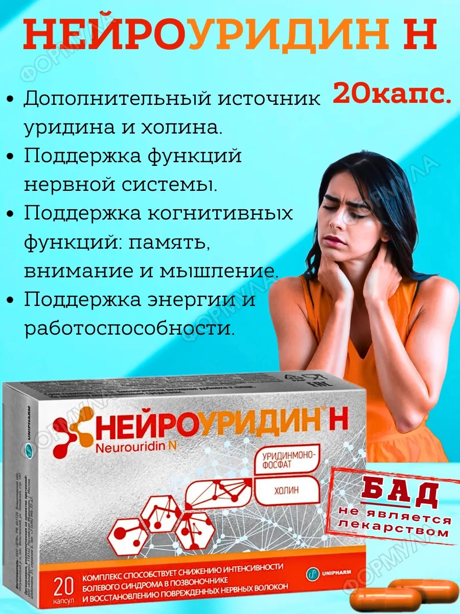 БАД Нейроуридин Н капсулы уридинмонофосфат холин для мозга памяти нервной системы внимания концентрации энергии работоспособности — это современная пищевая добавка, созданная для поддержки когнитивных функций и сохранения активности нервных клеток. Уникальное сочетание уридина и холина считается одним из наиболее ценных для поддержания работы нервной системы. Эти вещества естественным образом участвуют в обменных процессах, влияя на формирование связей между нейронами, синтез ацетилхолина и работу мозга.