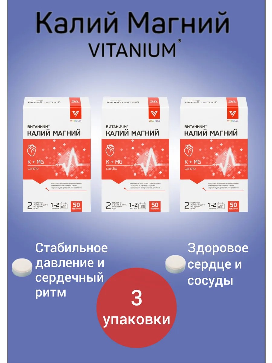 Калий Магний ВИТАНИУМ - Биологически активная добавка (БАД) к пище является дополнительным источником калия, магния, аспарагиновой кислоты, реализующих много направленное действие на организм - в частности, на сердечно-сосудистую и нервную системы. Способствует снижению риска возникновения нарушений работы сердца и сосудов и повышению стрессоустойчивости организма. Незаменим во время приема мочегонных, так как они активно выводят ионы калия и магния из организма. Информация о биологически активных веществах и их свойствах: - Магний способствует расслаблению сосудов и снижению давления, помогает действовать препаратам, разжижающим кровь, препятствуя тем самым образованию тромбов, защищает нервную систему от различных стрессов, повышает концентрацию внимания, улучшает качество сна. - Аспарагиновая кислота необходима для роста и жизнедеятельности клеток сердечной и нервной тканей, обеспечения слаженной работы сердца. Отвечает за накопление в организме калия и магния, обеспечивает их более высокую усвояемость. Защищает центральную нервную систему, способствуя уменьшению количества токсичного аммиака. Повышает устойчивость организма к недостатку кислорода и прочим внешним воздействиям.