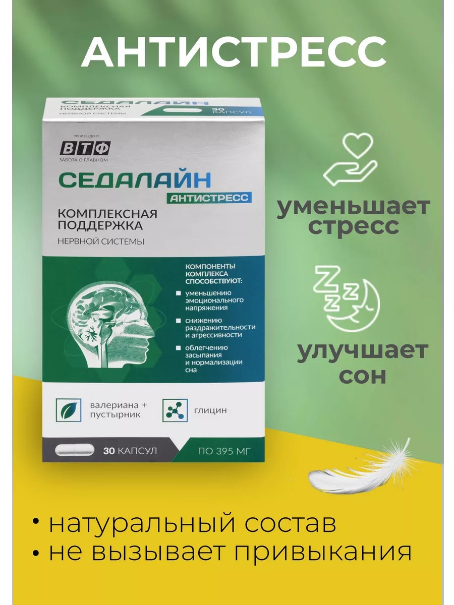 Sedaline dietary supplement contains motherwort and valerian extracts, as well as the amino acid glycine, which help strengthen the nervous system, improve mood and sleep, and increase stress resistance.