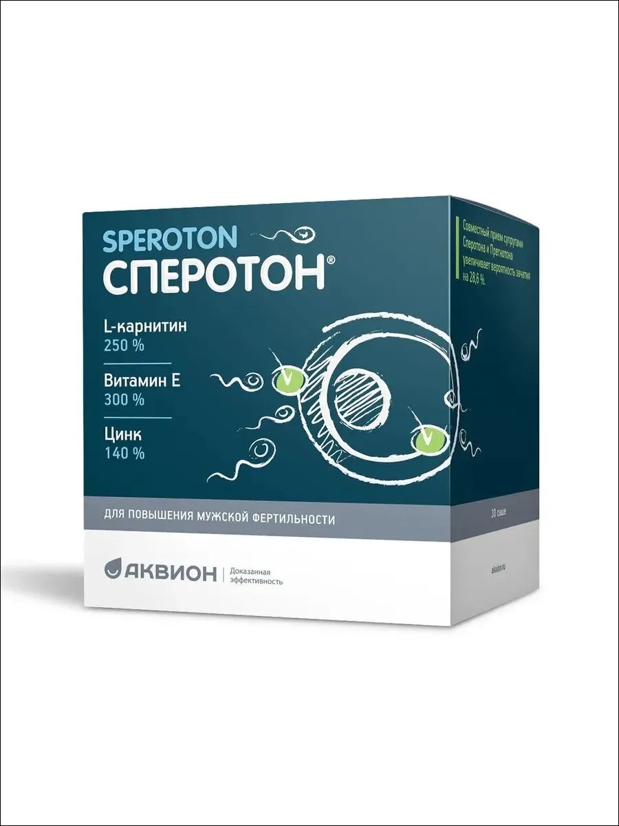 СПЕРОТОН – комбинированный препарат для повышения мужской фертильности.Стимулирует сперматогенез.Повышает концентрацию сперматозоидов в семенной жидкости.Увеличивает подвижность сперматозоидов.Не содержит гормональных компонентов.Не вызывает аллергических реакций и других побочных явлений.Компоненты Сперотона стимулируют сперматогенез, повышают концентрацию сперматозоидов в семенной жидкости, увеличивают их подвижность.Важно отметить, что в 1 саше Сперотона содержится 750 мг L-карнитина, а чем выше содержание L-карнитина в препарате для повышения мужской фертильности, тем эффективнее препарат. Также Сперотон содержит в повышенных дозировках компоненты, которые влияют на сперматогенез – фолиевую кислоту, витамин Е и цинк (при этом их дозировки не превышают верхний допустимый уровень потребления).L-карнитин - 750 мг - 250 * (% от уровня потребления).Цинк - 21 мг - 140 * (% от уровня потребления).Витамин Е - 30 мг - 300 * (% от уровня потребления).Витамин В9 - 400 мг - 200 * (% от уровня потребления).Селен - 70 мг - 100 * (% от уровня потребления).Порядок применения и дозировки: взрослым 1 раз в день во время еды, растворив содержимое саше-пакета в 1 стакане (200-250 мл) воды.Продолжительность приема – 1 месяц. При необходимости прием можно повторить.СПЕРОТОН необходимо принимать только 1 раз в день.Содержимое саше-пакета растворяют в в целом стакане воды. Напиток имеет вкус апельсина, его прием не вызовет проблем и неприятных вкусовых ощущений.Оптимальная длительность применения – 3 месяца. Такой срок связан с тем, что время созревания сперматозоидов составляет 72 дня, и вещества, которые положительно действуют на сперматогенез, должны поступать в организм в течение всего этого периода. 1 упаковки Сперотона хватает на 1 месяц приема. Таким образом для 3-месячного курса понадобится 3 упаковки.