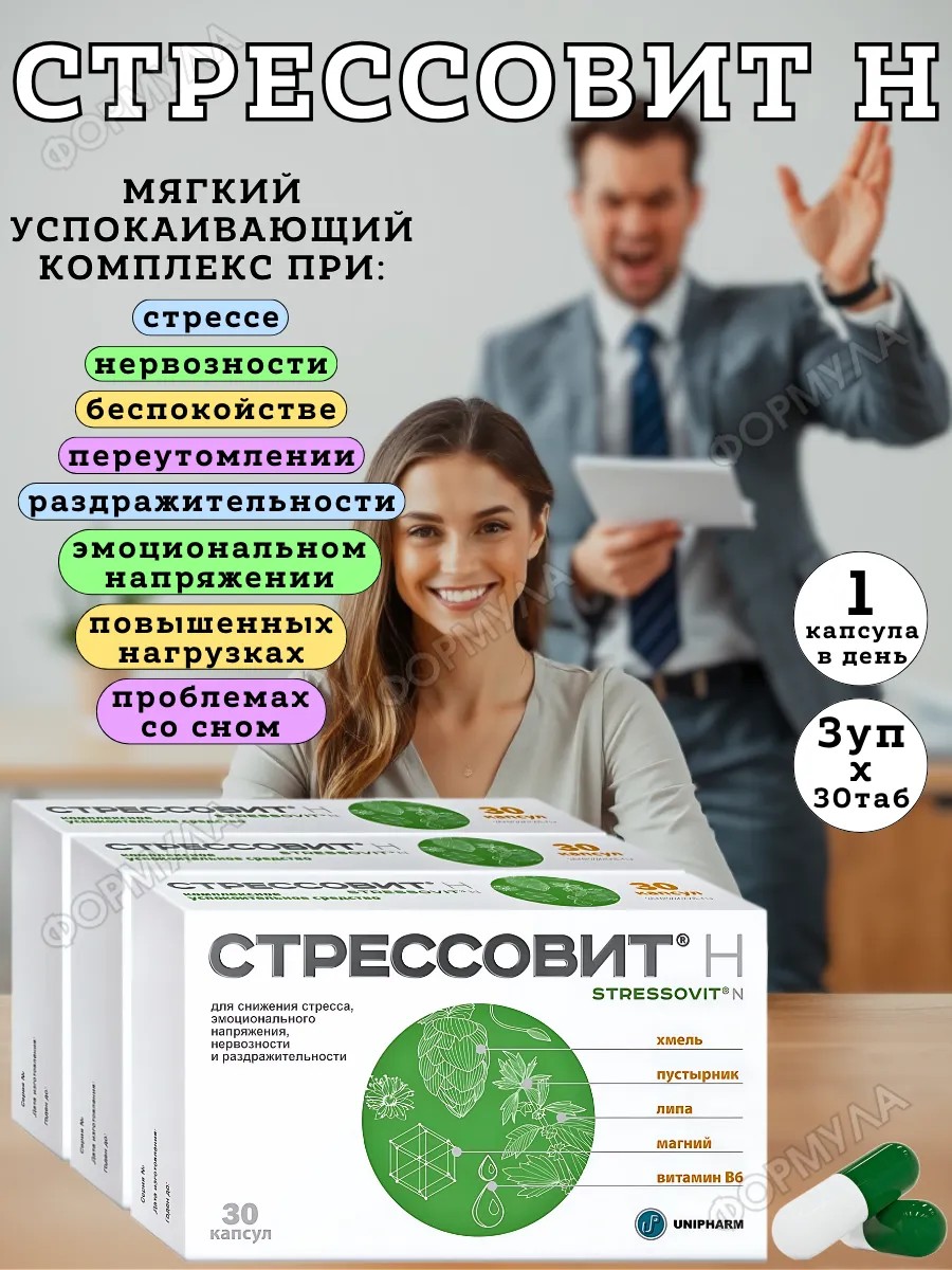 Стрессовит Н отличается от других успокаивающих добавок комплексным составом, который сочетает натуральные экстракты (хмель, липа, пустырник) с магнием и витамином В6. Эта комбинация направлена не только на снижение стресса, но и на поддержку нервной и сердечно-сосудистой системы, улучшение сна и нормализацию эмоционального состояния.