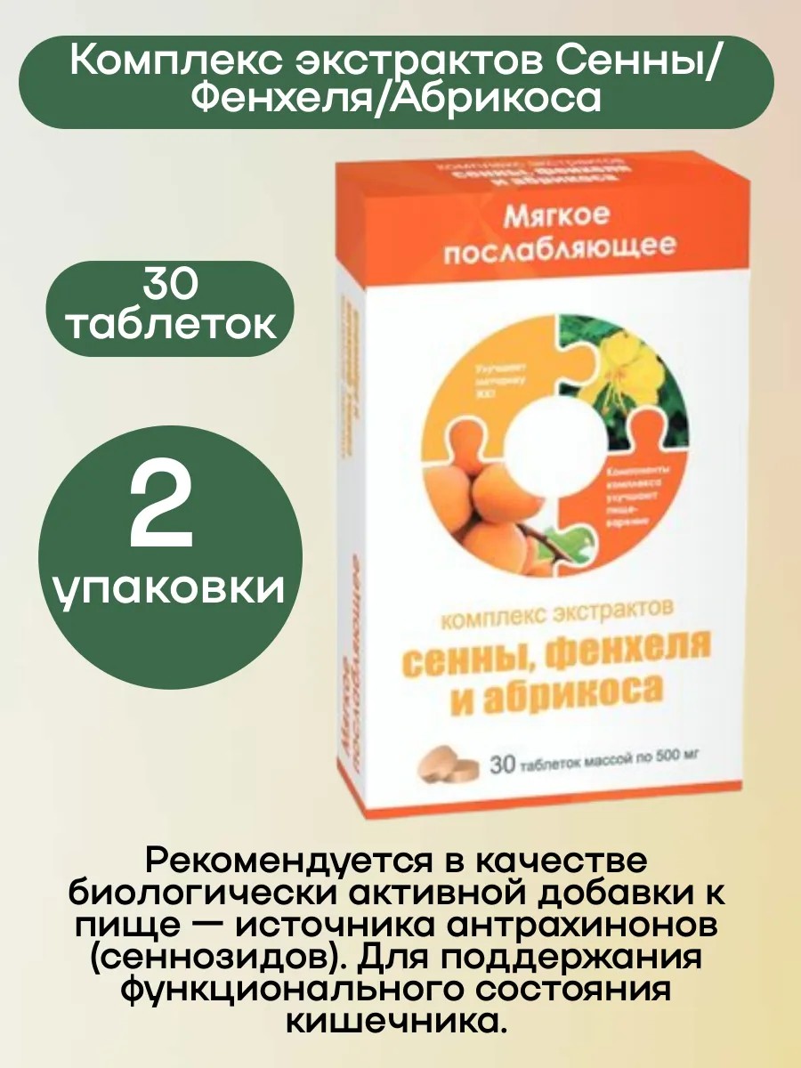| Комплектация | Комплекс экстрактов Сенны/Фенхеля/Абрикоса таб 30 шт; 2 упаковки |