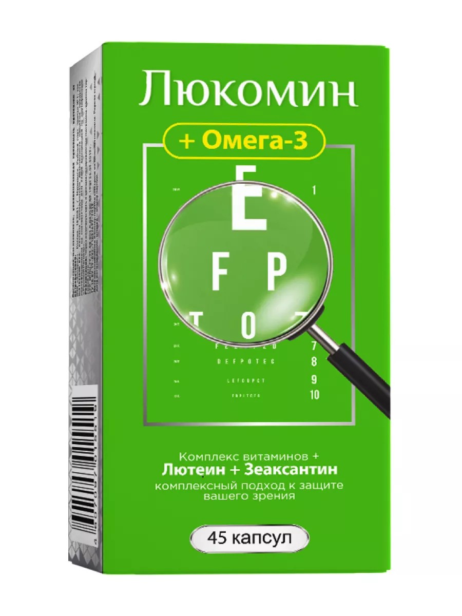 Люкомин Комплекс витаминов с лютеином, зеаксантином и Омега-3 способствует: восполнению недостатка витаминов и микроэлементов для глаз; увеличению активности рецепторов глаз; улучшению зрения; устранению симптома усталого глаза после зрительных нагрузок; оздоровлению сетчатки после конъюнктивита и других воспалительных процессов. Принимать детям с 7-ми до 11-ти лет по 2 капсулы 1 раз в день во время еды; Взрослым и детям старше 11 лет по 2 капсулы 1-2 раза в день во время еды; Продолжительность приема 1 месяц. При необходимости прием можно повторить.