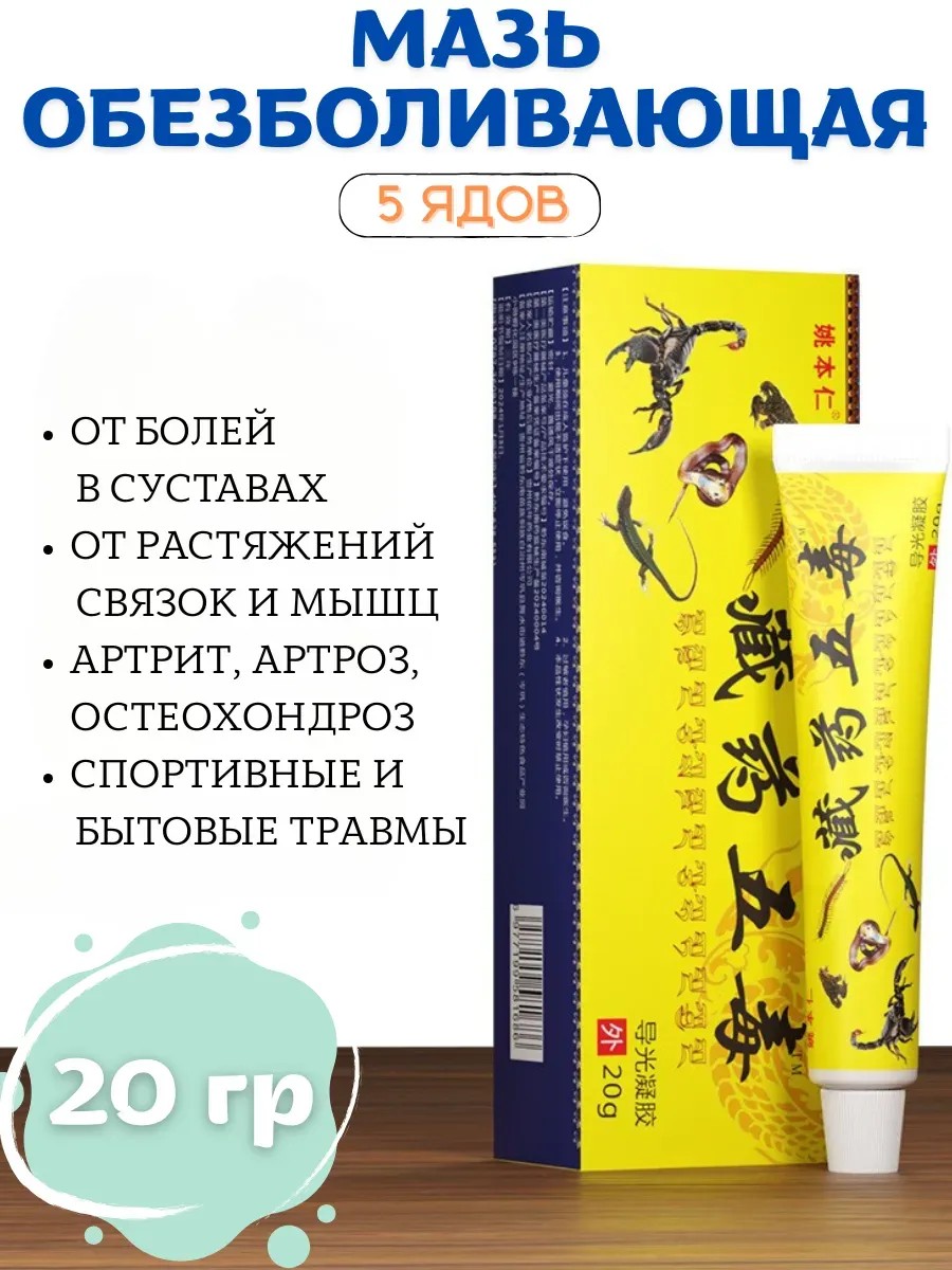 Китайская мазь помогает при болях в суставах, спине, шее, пояснице и мышцах. Уникальный состав с ядом скорпиона и экстрактами лекарственных растений снимает воспаление, отеки, спазмы, активизирует кровообращение и ускоряет регенерацию хрящевой ткани.