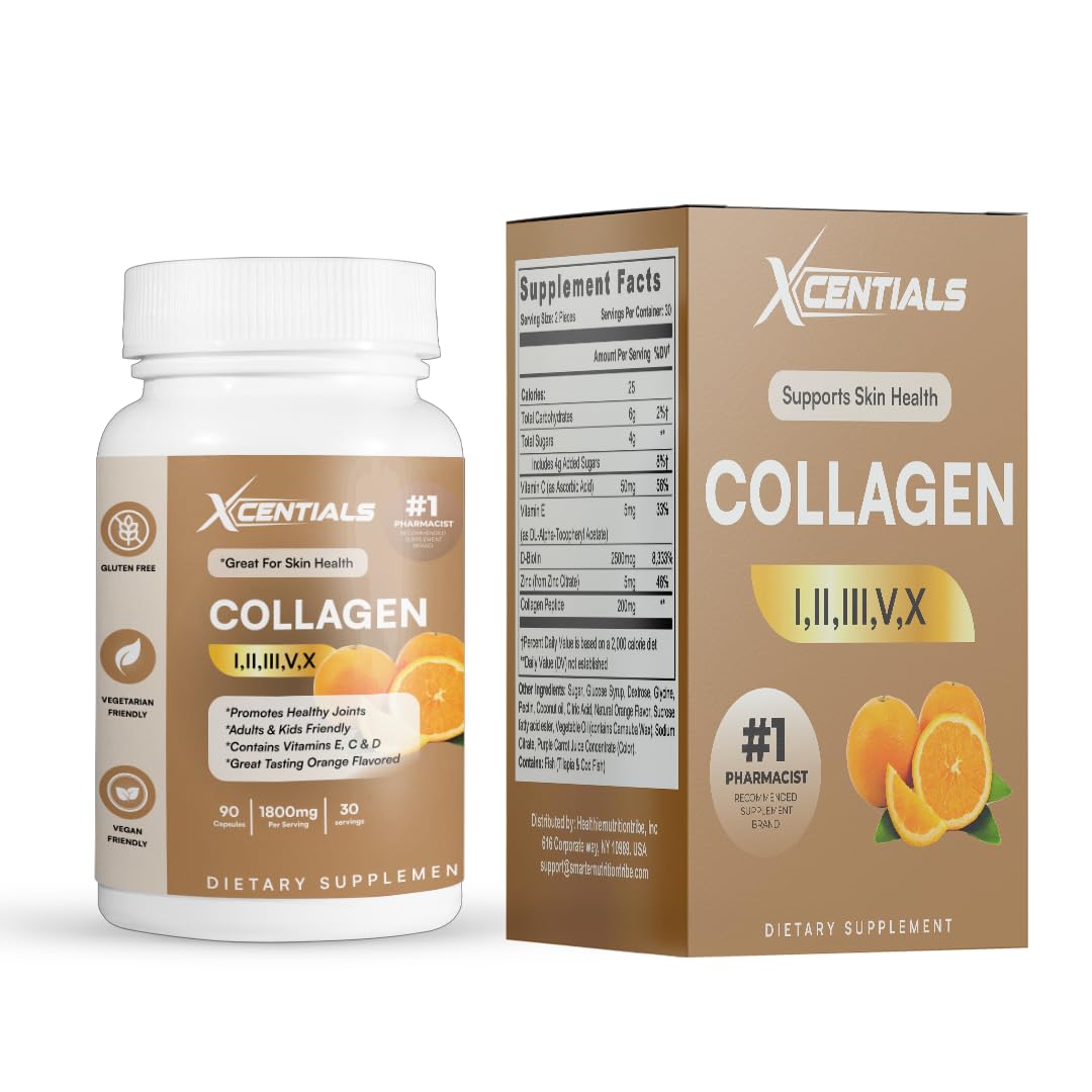 Xcentials Multi Collagen Peptides Capsules Hydrolyzed Types I II III V & X for Skin Hair Nail & Joint Support 1800 mg per Serving 90 Capsules