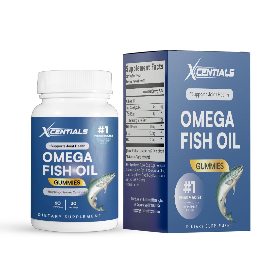 Xcentials Omega 3 Fish Oil Gummies Contains 100mg of Fish Oil Powder 13.2 DHA + 2.8MG EPA Heart Brain & Eye Support No Fishy Aftertaste with Raspberry-Flavored 60 Gummies