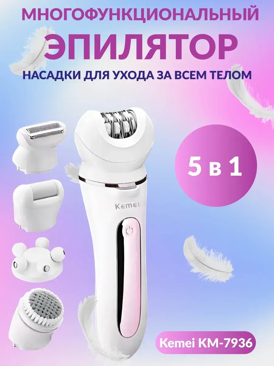 Беспроводной Женский эпилятор - эффективное средство для удаления волос. KM-7936 имеет 5 сменных насадок: эпилятор, бритву, массажер, роликовую пилку - скраб для обработки пяток и щеточку для умывания лица. 1) Эпилятор поставляется с 18 пинцетами для более быстрого удаления самых жестких волос. Также есть подсветка. 2) Гипоаллергенная безболезненная электрическая бритва острая и прочная электрическая бритва для женщин имеет гипоаллергенные лезвия из нержавеющей стали, которые помогают мягко скользить по изгибам и контурам тела без боли или раздражения. Безболезненное бритье, которое не раздражает чувствительную кожу. 3) Скраб для ног без запаха имеет кварцевые абразивные головки, грубые для удаления упрямой омертвевшей кожи, средние для удаления грубой омертвевшей кожи и отлично подходит для ежедневного ухода. Вы можете выбрать правильную абразивную головку в соответствии с заботой о вашей коже, чтобы восстановить тонкую и гладкую кожу на ногах. 4) При использовании насадки-массажера Вы можете выбрать низкую скорость для расслабляющего ощущения или высокую скорость для более тщательного массажа. Вы можете использовать этот массажер для царапин на любой части вашего тела, такой как голова, шея, спина и т. д., так как он является имитацией человеческого пальца для расслабляющего массажа. Подходит для бритья всего тела и уходом за кожей ваших стоп. Имеет широкую область применения - для лица, подмышек, стоп и зоны бикини. Данная электробритва 5 в 1: эпилятор, триммер, массажер, пемза для стоп и насадка-щеточка. Подходит для удаления всех типов волос (коротких и длинных).