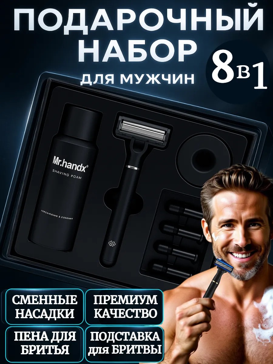Подарочный набор для мужчин 8 в 1: станок для бритья с 4 сменными кассетами с 6 лезвиями, пена для бритья Mr.Handx 115 г, подставка под бритву, подарочная упаковка.