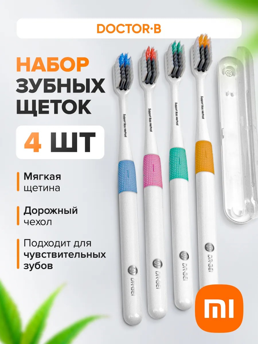 This Xiaomi 4-piece toothbrush set is designed for family use, as each brush is uniquely colored and comes in an individual, sealed case. The travel case is especially handy if you decide to take the toothbrush with you on the go. Each toothbrush has three types of bristles with different textures for optimal cleaning. The handle has a rubber insert for a secure fit when stored in a special wall holder. Only high-quality materials are used: the handle surface is made in Germany, and the bristles are made in Japan. The handle has an antibacterial coating with silver ions, and the rubber insert ensures a secure grip. This family toothbrush set is suitable for use with the Bass method. With this method, the toothbrush head is positioned at a 45-degree angle to the tooth axis. This ensures that the tips of the bristles touch both the lateral surface of the tooth and the gingival sulcus. As it moves, its fibers clean both the spaces between teeth and the pocket between the teeth and gums. This promotes accelerated plaque removal, gum massage, and teeth whitening. All bristles have a very fine tip that doesn't irritate gums. Xiomi toothbrushes with fine bristles in medium and soft hardness are suitable for the whole family, both adults and children. The center row is longer and stiffer, so the soft side bristles won't irritate gums while brushing, while the stiffer central bristles effectively clean the neck of the tooth and the pocket. For those who don't use ultrasonic electric toothbrushes, this soft-hardness option is ideal for oral hygiene. To determine whether a mi toothbrush is suitable for braces, consult your dentist. A set of toothbrushes for sensitive teeth and gums makes a great gift for you and your loved ones for a birthday, housewarming, or any other occasion. Beautiful and healthy teeth are guaranteed!
