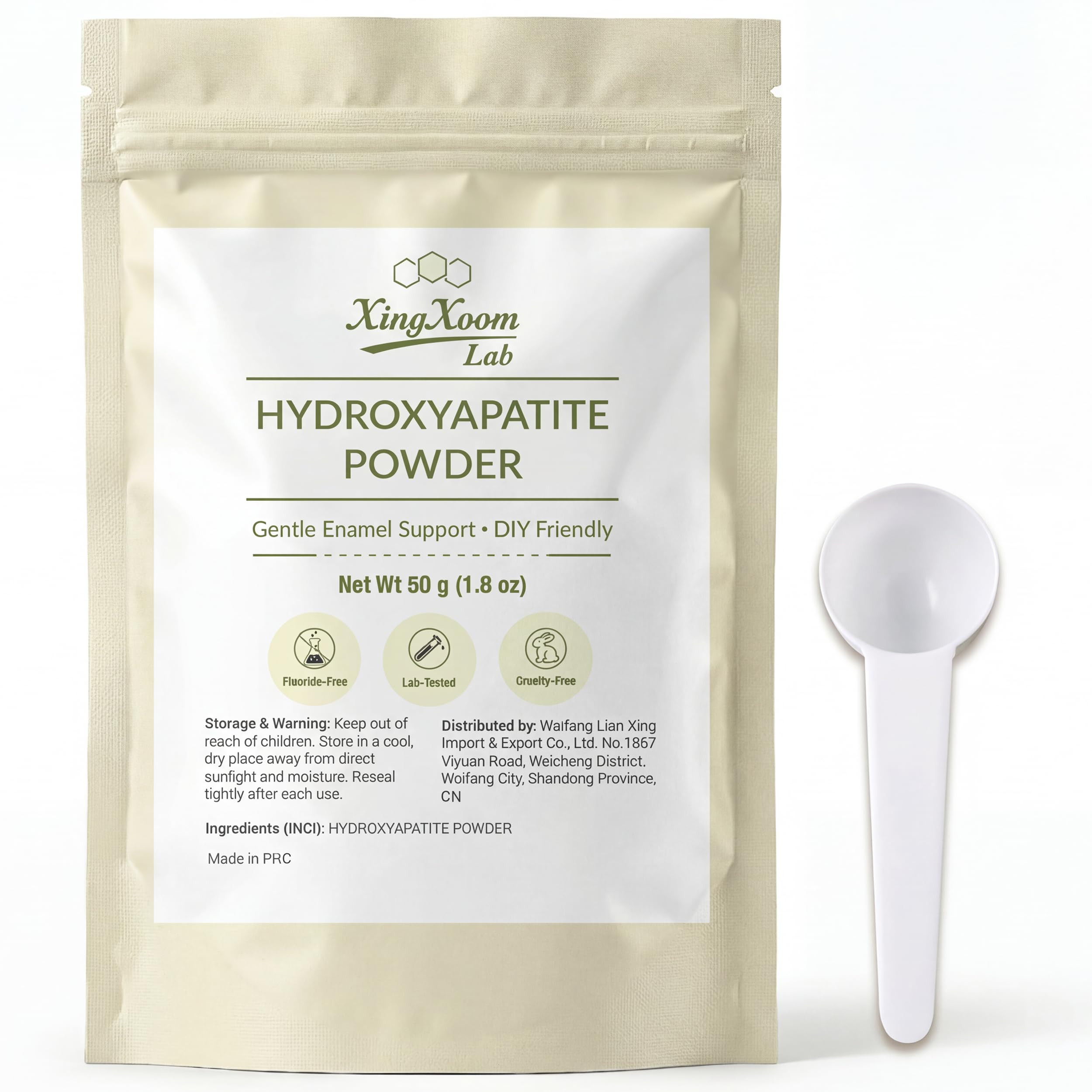 Welcome to XingXoom Lab – Where Science Meets Nature. Are you looking for a safer, smarter way to care for your smile? Hydroxyapatite is the primary building block of your teeth and bones (making up 97 of your enamel). Over time, enamel can wear down, leading to sensitivity and dullness. XingXoom Lab Hydroxyapatite Powder restores what modern life takes away. Why Choose XingXoom Lab? We believe in transparency and purity. Our powder is sourced responsibly and lab-verified to ensure you are putting only the best ingredients in your mouth. It acts as a shield, filling the microscopic channels that lead to sensitive nerves, providing relief and protection without the use of fluoride. How to Use (The DIY Guide): OPTION A: The "Supercharge" (Easiest) Simply wet your toothbrush, apply your regular toothpaste, and then dip it into the XingXoom powder. Brush as usual for 2 minutes. OPTION B: The "Purist" DIY Toothpaste Recipe Create your own natural paste in your kitchen! 2 tbsp Coconut Oil (softened) 1 tbsp XingXoom Lab Hydroxyapatite Powder 1 tsp Calcium Carbonate (optional for texture) 5-10 drops Peppermint Essential Oil (for freshness) Mix until smooth and store in a small glass jar. OPTION C: Gum Massage Apply the powder directly to gums with a clean finger to support gum health and neutralize acidity. Product Features: Net Weight: 50g (1.8 oz) - Lasts for months of daily use. Texture: Ultra-fine, non-gritty powder. Suitability: Vegan, Gluten-Free, Cruelty-Free. Safety: Fluoride-Free, SLS-Free, Paraben-Free. Disclaimer: This product is not intended to diagnose, treat, cure, or prevent any disease. Results may vary.SAFE FOR THE WHOLE FAMILY: A worry-free choice for parents. Because Hydroxyapatite is biocompatible and non-toxic, it is safe if accidentally swallowed. This makes it the perfect fluoride-free option for those seeking natural oral hygiene solutions. GENTLE NATURAL POLISHING: Unlike harsh charcoal or abrasive strips that strip enamel, our Hydroxyapatite gently polishes the tooth surface. It helps fill micro-defects to create a smoother, glossier surface that naturally reflects light better, revealing a brighter smile without the sensitivity. DIY FRIENDLY VERSATILE USAGE: Unleash your inner chemist! This powder is designed for easy blending. (1) Create your own custom toothpaste by mixing with coconut oil and essential oils. (2) Supercharge your current routine by dipping your damp toothbrush into the powder. (3) Mix with water for a soothing, mineral-rich mouth rinse. ADVANCED ENAMEL SUPPORT: Daily exposure to acidic foods can weaken teeth. Our micro-fine powder helps plug exposed dentinal tubules and supports the natural remineralization process of enamel. Regular use helps strengthen tooth structure from the outside in, making it ideal for those with hot cold. 100 PURE LAB-TESTED QUALITY: Experience the gold standard of oral care with XingXoom Lab. Our Hydroxyapatite powder is strictly tested for purity and heavy metals, containing NO fluoride, fillers, artificial flavors, or preservatives. A biomimetic ingredient that mirrors the natural mineral structure of your teeth, offering a clean, safe, and effective alternative to conventional chemicals.
