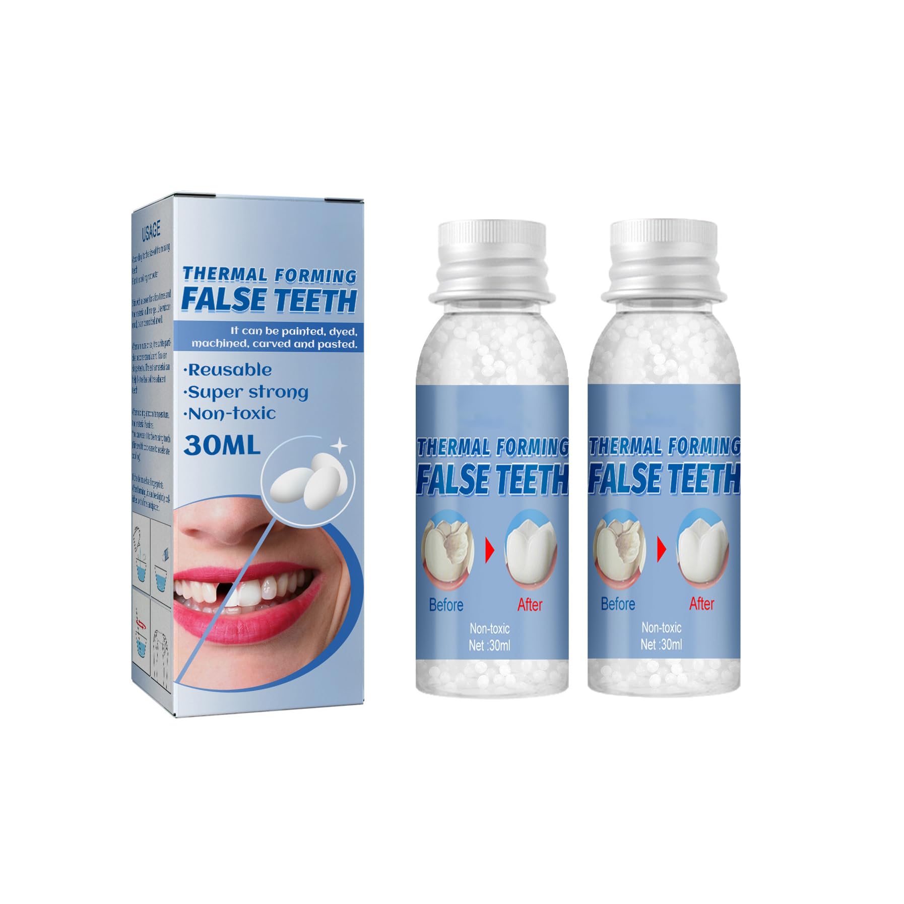 How to Use: 1. Prepare a cup of boiling water and pour the amount of about 15 pieces of gel (for one piece of fangs) 2. Stir in the cup and then get it out when it goes to be transparent. 3. Make the gel cooled for about 5 seconds after taking it out of the cup. And then put the gel into the fangs slot so that you can glue the fangs to your teeth, using your hands to squeeze the gel into both the gaps between teeth and the inner side of your teeth. This can make all of this to be a complete and compatible tooth socket. 4. Get the tooth socket out and cool it for some minutes till the gel become white. 5. Repeat these steps for another fang. Please note that these teeth sockets can be used several times. Specification: Material: Resin Content: 30ML Package Included: 1 2 3Pcs Tooth Repair Granules - 30ml Note: 1. Actual color may be slightly different from the image due to different monitor and light effect. 2. Please allow 1-3mm deviation due to manual measurement.Multiple Uses: Tooth Repair Granules Can be used for broken teeth, large gaps, uneven teeth, missing teeth. It can also be used for creative purposes, such as Halloween makeup and clothing design. Natural Comfort: Designed with ultra-thin and flexible technology, it looks like a perfect set of teeth and gums, comfortable without foreign body sensation. Take care of your teeth 24 hours a day for a natural and confident smile. Free to Shape: Put the beads in boiling water, soften quickly and can shape to fit your teeth, helping you fill in the missing spots. Particles can also be easily removed. Safe Material: Made of high-quality and completely safe materials, using reusable and environmentally friendly natural resin based materials, odorless, and not absorbed by the human body. Temporary Dental Restoration Kit: For fillings to repair missing, gapped or broken teeth. Great for immediate and temporary use, it helps you smile and keep your teeth naturally beautiful.Tooth Repair Granules, Temporary Tooth Repair Kit, Temporary Tooth Filling Kit, Tooth Repair Granules Kit, Temporary Tooth for Everyone (2Pcs) How to Use: 1. Prepare a cup of boiling water and pour the amount of about 15 pieces of gel (for one piece of fangs) 2. Stir in the cup and then get it out when it goes to be transparent. 3. Make the gel cooled for about 5 seconds after taking it out of the cup. And then put the gel into the fangs slot so that you can glue the fangs to your teeth, using your hands to squeeze the gel into both the gaps between teeth and the inner side of your teeth. This can make all of this to be a complete and compatible tooth socket. 4. Get the tooth socket out and cool it for some minutes till the gel become white. 5. Repeat these steps for another fang. Please note that these teeth sockets can be used several times. Specification: Material: Resin Content: 30ML Package Included: 1 2 3Pcs Tooth Repair Granules - 30ml Note: 1. Actual color may be slightly different from the image due to different monitor and light effect. 2. Please allow 1-3mm deviation due to manual measurement.Multiple Uses: Tooth Repair Granules Can be used for broken teeth, large gaps, uneven teeth, missing teeth. It can also be used for creative purposes, such as Halloween makeup and clothing design. Natural Comfort: Designed with ultra-thin and flexible technology, it looks like a perfect set of teeth and gums, comfortable without foreign body sensation. Take care of your teeth 24 hours a day for a natural and confident smile. Free to Shape: Put the beads in boiling water, soften quickly and can shape to fit your teeth, helping you fill in the missing spots. Particles can also be easily removed. Safe Material: Made of high-quality and completely safe materials, using reusable and environmentally friendly natural resin based materials, odorless, and not absorbed by the human body. Temporary Dental Restoration Kit: For fillings to repair missing, gapped or broken teeth. Great for immediate and temporary use, it helps you smile and keep your teeth naturally beautiful.