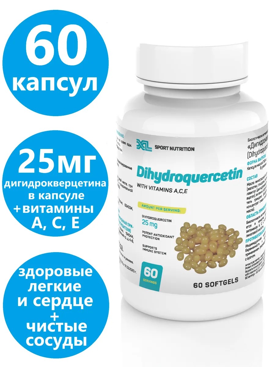 В каждой капсуле содержится 25 мг (суточная потребность взрослого человека) дигидрокварцетин плюс 0.8мг витамина А, 10мг витамина Е и 30мг витамина С. В упаковке содержится 60 капсул по 790 мг, которых хватит на полноценный курс.