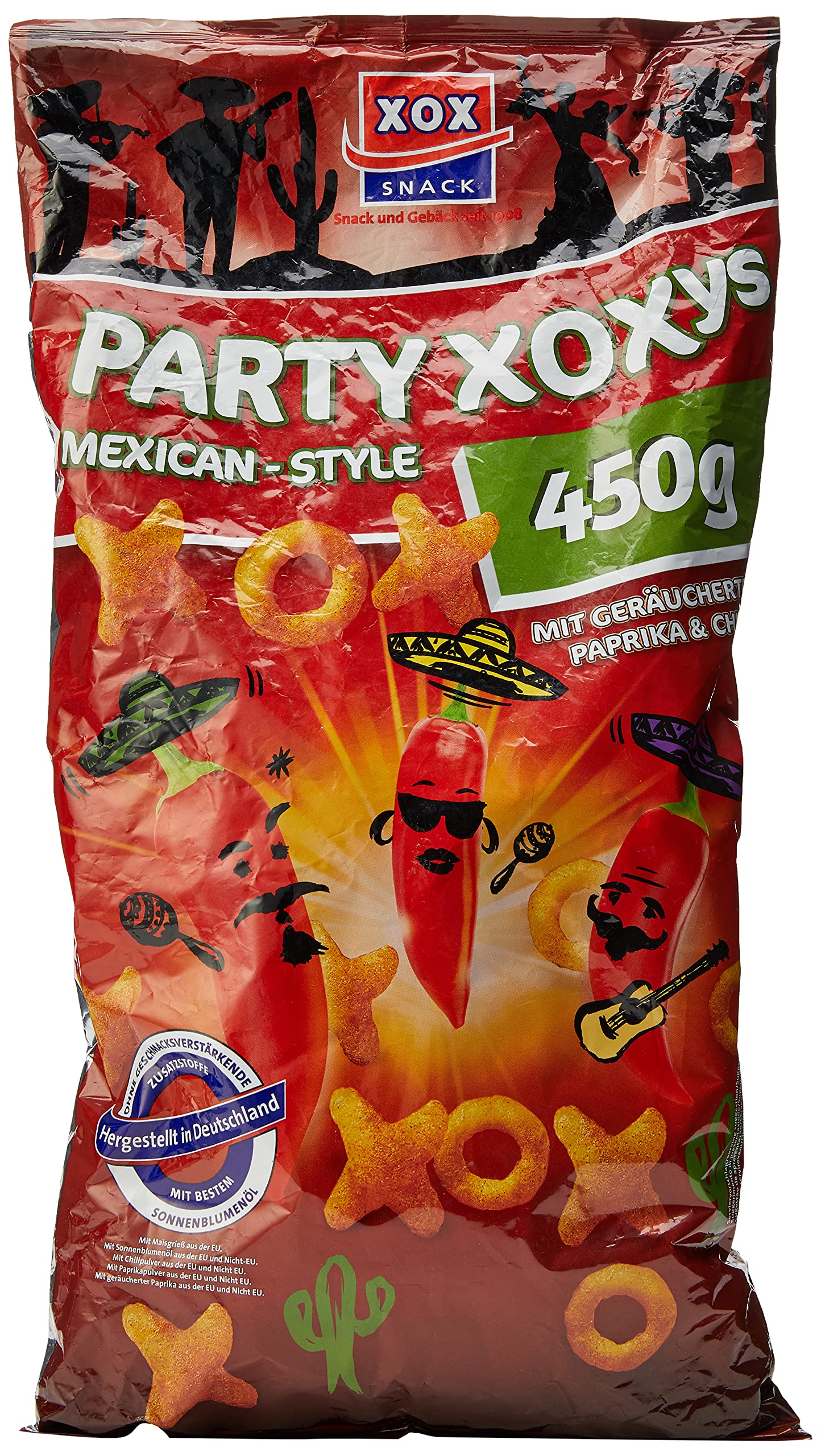 The Mexican x-o-x snack for hot nights: XOX party-xoxys Mexican 450g with chili-chili-cream flavor is a popular snack at every party. This delicious corn snack is produced without flavor enhancers and is especially suitable for savory snacks. INGREDIENTS Ingredients: 60 corn semolina, 28 sunflower oil, salt, sugar, yeast extract, whey powder, maltodextrin, granulated stock (salt, hydrolyzed rapeseed and corn proteins, sunflower oil), spices, 0.8 chili powder, 0.3 smoked pepper powder. Peppers (Bell peppers, smoked), barley malt, spelt, natural flavoring, rapeseed oil, acidifier: lactic acid, citric acid. May contain traces of US. SAFETY WARNING May contain traces of peanuts. See moreXOX Gebäck PartyXOXys Style Mexican 450 gDESCRIPTION DU PRODUIT DESCRIPTION DU PRODUIT Le snack mexicain x-o-x pour les nuits chaudes : XOX party-xoxys mexicain 450 g au goût de crème chili-chili-crème est un grignotage populaire à chaque fête. Le délicieux snack de maïs est produit sans exhausteur de goût et est particulièrement adapté pour les collations salées. INGRÉDIENTS Ingrédients: 60 de semoule de maïs, 28 d'huile de tournesol, sel, sucre, extrait de levure, poudre de lactosérum, maltodextrine, bouillon granulé (sel, protéines de colza hydrolysées et de maïs, huile de tournesol), épices, 0,8 poudre de piment, 0,3 de poudre de poivron fumé. poivrons (Poivrons, fumée), ORGERSTENMALZ, POUILLE D'ACIRE, arôme naturel, huile de colza, acidifiant: acide lactique, acide citrique. Peut contenir des traces de NOUS. AVERTISSEMENT DE SÉCURITÉ Peut contenir des traces d'arachides. Voir plus