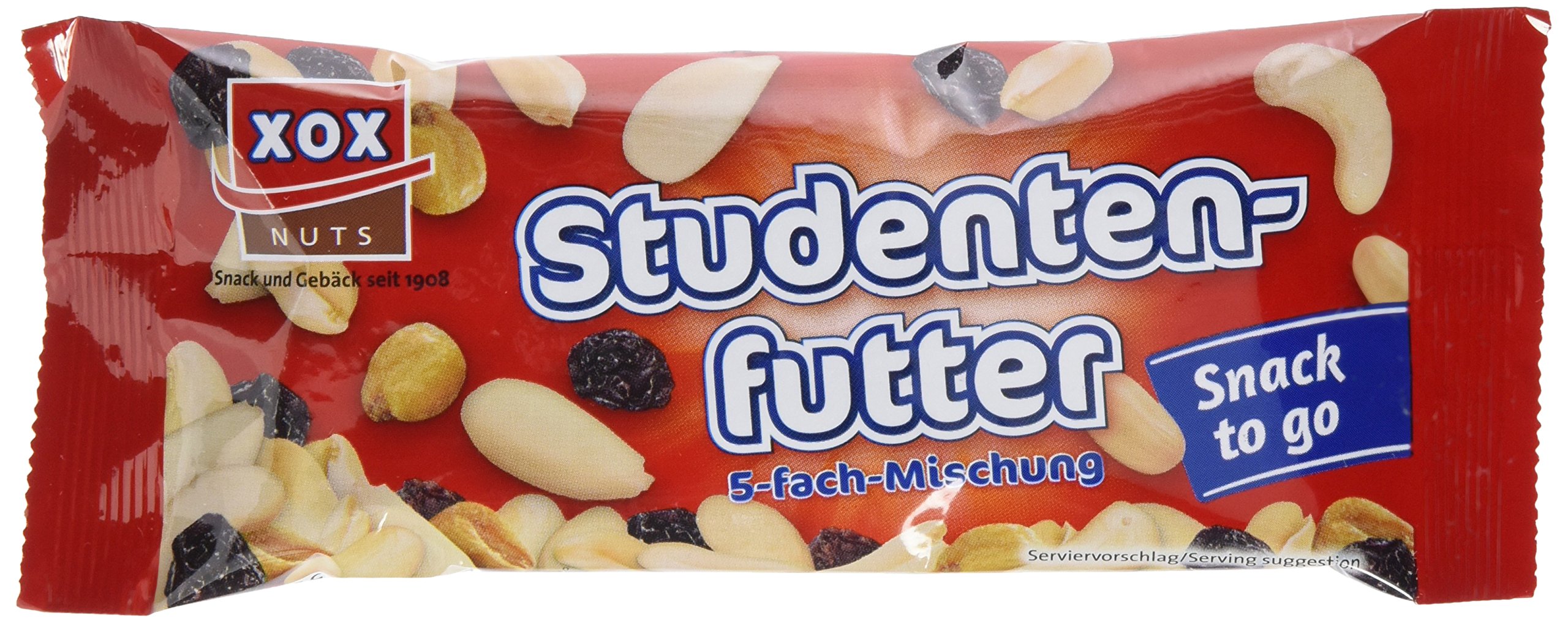 The classic now also from XOX!XOX student feed 50g - the ideal energy supplier for everyone who eats a balanced diet in a healthy lifestyle.Whether at school, studying, at work or comfortable at home, there is something for every taste.The robust mixture contains roasted peanuts, blanched almonds, cashew nuts, wineberries and fried corn welds.The practical small bag is ideal as a snack for in between! Ingredients / ingredients Ingredients: 60% peanut nut core (cultivated, roasted peanut nuclei, blanched almonds, cashew nuts), wineberries 30% (wine-berries, sunflower oil), fried, salted maize corner, palm oil, dining salt), sunflower oil, palm oil.Can contain traces of hazel, whale, para and pecanes. Instructions Ready for consumption Address manufacturer/importer Am Hastebach 8, 31789 Hameln More The practical small bag is ideal as a snack for in between!.contains roasted peanuts, blanched almonds, cashew nuts, wineberries and fried corn welds. Der Klassiker jetzt auch von XOX! XOX Studentenfutter 50g – der ideale Energielieferant für alle, die sich im Rahmen einer gesunden Lebensweise ausgewogen ernähren. Ob in der Schule, beim Studium, im Job oder gemütlich zu Hause, hier ist für jeden Geschmack etwas dabei. Die kernige Mischung beinhaltet geröstete Erdnüsse, blanchierte Mandeln, Cashewkerne, Weinbeeren und frittierte Maiskörner. Der praktische Kleinbeutel eignet sich dabei hervorragend als Snack für zwischendurch! INHALTSSTOFFE / ZUTATEN Zutaten: 60% ERDNUSS-NUSSKERN-Mischung (enthäutete, geröstete ERDNUSSKERNE, blanchierte MANDELN, CASHEWKERNE), Weinbeeren 30% (Weinbeeren, Sonnenblumenöl), frittierte, gesalzene Maiskörner 10% (Maiskörner, Palmöl, Speisesalz), Sonnenblumenöl, Palmöl. Kann Spuren von HASEL-, WAL-, PARA- und PECANÜSSE enthalten. GEBRAUCHSANWEISUNG Verzehrfertig ANSCHRIFT HERSTELLER/IMPORTEUR Am Hastebach 8, 31789 Hameln MehrDer praktische Kleinbeutel eignet sich dabei hervorragend als Snack für zwischendurch!. beinhaltet geröstete Erdnüsse, blanchierte Mandeln, Cashewkerne, Weinbeeren und frittierte Maiskörner.XOX Studentenfutter, 10er Pack (10 x 50 g)