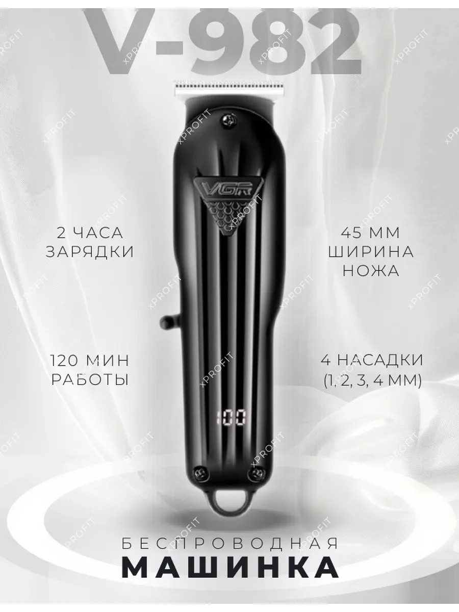Машинка для стрижки волос VGR V-982 - мощный роторный двигатель с увеличенным крутящим моментом, имеет профессиональные ножи из нержавеющей стали. Отличаются своей твердостью и долговечностью, что позволяет машинке справляться с самыми густыми и жесткими волосами. Профессиональная машинка оснащена инновационным встроенным Li-Ion аккумулятором 600 mAh. Вы можете выполнять стрижки как автономно, так и от сети. Отлично подходит для парикмахерской или домашнего использования. Led дисплей показывает уровень заряда. Характеристики: Бренд: VGR; Водонепроницаемость IPX6; Led дисплей: показывает уровень заряда; Индикаторы: работы и заряда аккумулятора; масло; Насадки: (4 шт) 1 мм; 2 мм; 3 мм; 4 мм; Аккумулятор: Li-on 600 mAh; Время зарядки: 2 часа; Время работы при полной зарядки 120 минут; Мощность: 5 Вт; Мотор: роторный 6600 об/мин; Шнур USB без блока питания: 1м; Низкий уровень шума: подходит для детей ; Применение: Стрижка волос; стрижка бороды, окантовка; Ширина ножа: 45мм