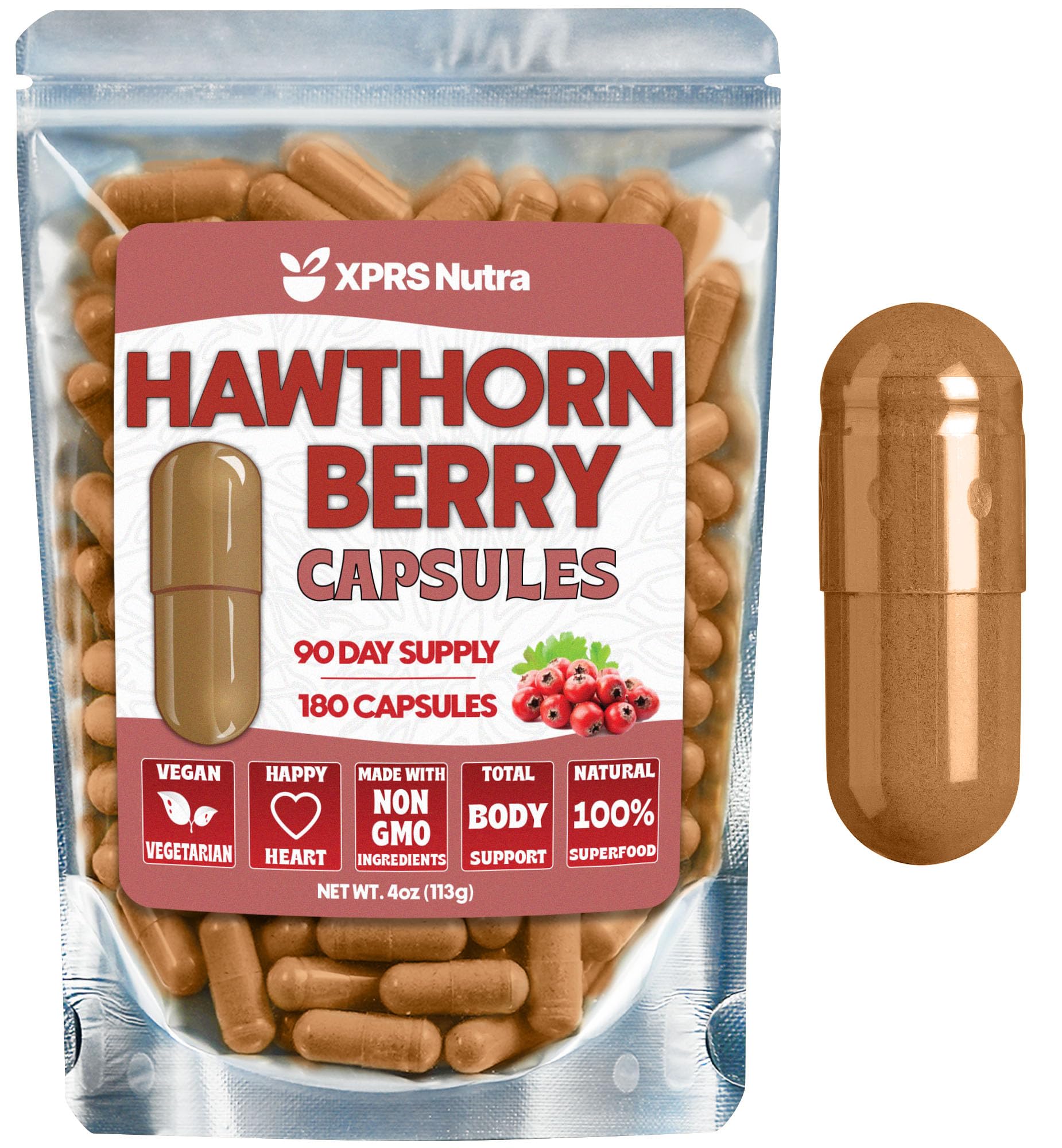 Love Your Supplements: You'll love the superior quality of our organic hawthorn berry capsules. Here at XPRS Nutra, our first priority is ensuring that we are providing our customers with premium hawthorn extract supplement in an ethical manner and at an affordable price. Thank you for your purchase of fresh hawthorn berry - you're helping to support a local business that employs locally. Multiple Health Benefits: Hawthorne berries are a popular choice for concentration, endurance, energy and digestion. In fact, the benefits of hawthorn berry tablets are too numerous to list! Research hawthorn berry tincture to learn of its many uses. Our hawthorn pills are vegan-friendly and gluten-free. We love our espino blanco hawthorn supplement and take it ourselves!. Mental Kickstart: Hawthorn berry herb contains high amounts of chlorogenic acid (CGA) that supercharges cognitive function. Want to have laser focus? Try our hawthorne powder today! Not only does hawthorn berry extract support optimum brain activity but hawthorn berry whole is a potent hair and skin nutrient. Try organic hawthorn berries whole for total body support and be amazed!. Immune System Boost: Hawthorne extract capsules are full of flavonoids that help immune cells fight free radicals. Just one serving every morning of hawthorn extract capsules that are packed with nutritious hawthorn berries will get your day off to a good start! Have confidence that our hawthorne berry supplements are fresh and lab tested for purity. Heart Hero: Our hawthorn berry capsules contain 100 pure hawthorne supplement with zero additives and preservatives. Try our potent hawthorn berry supplement in capsules to nourish your cardiovascular system every day. No need to worry about the taste, our hawthorne berry powder is conveniently packaged in vegan pills produced sustainably in USA.