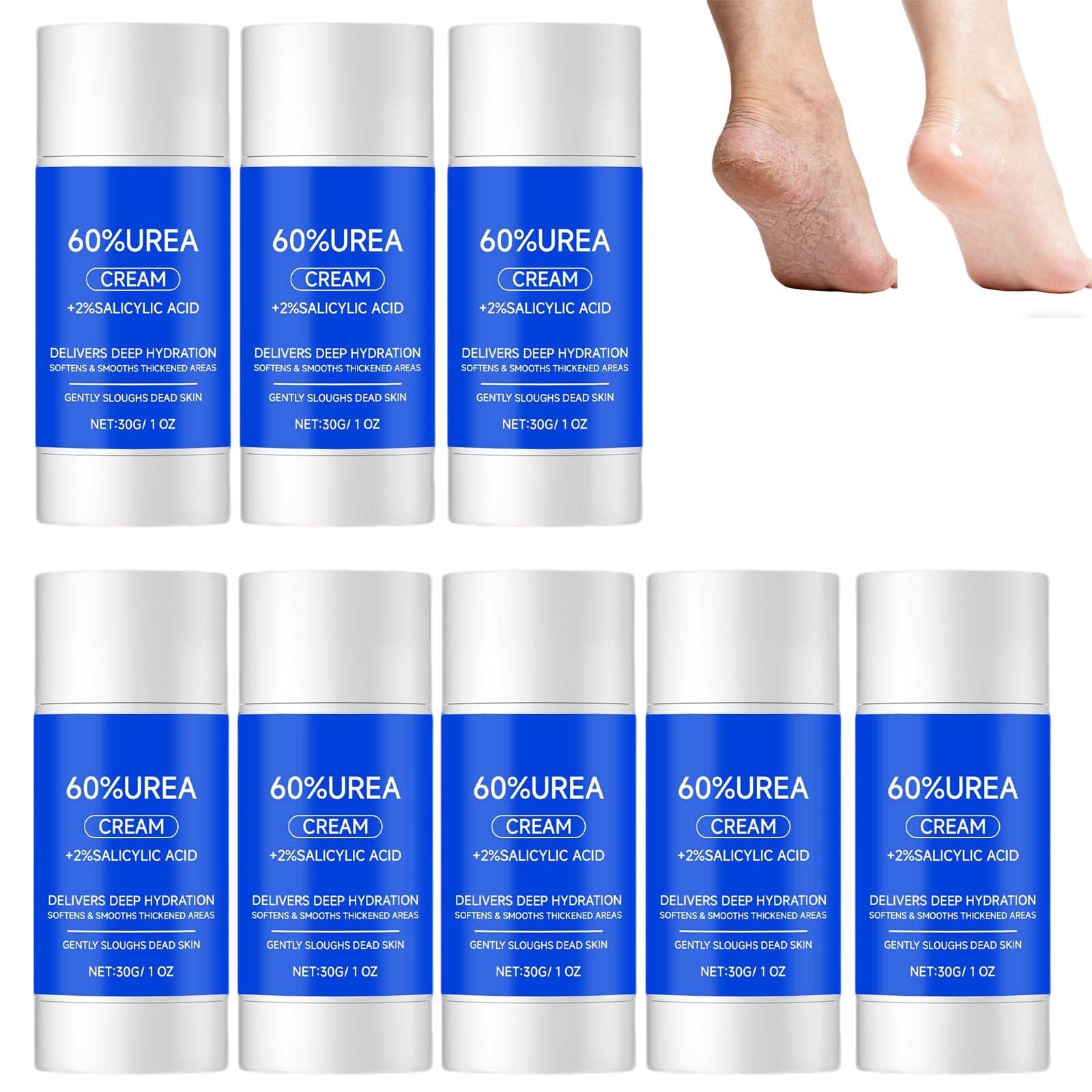 The Urea Foot Cream is a maximum-strength urea foot cream and callus remover for feet, targeting dry heels and feet with intensive foot repair. It acts as a foot moisturizer and heel balm, while the cracked heel stick facilitates the treatment of cracked heels for dry feet. Specification: Item Name: Urea Foot Stick Net Contents: 30g Hard Shelf life: 3 years Package includes: 2 4 6 8 sq ft Footrests NOTE: 1. Please allow 1-2 cm differences due to manual measurement. 2. Due to different displays and lighting, the image may not show the actual color of the item. Thank you for your understanding. About after-sales service: If you encounter any problems while purchg and using our products, please contact us promptly we will assist you 24 hours a day. SAFETY WARNING Store in a cool, dry place away from direct sunlight. Keep out of reach of children.Intensive Solution: Ideal for dry feet and severe cracks, it provides intensive foot repair and treatment for cracked heels, ensuring reliable daily foot care. Exfoliating and Renewing: This dead-skin-dissolving foot balm also acts as an exfoliating moisturizer consistent use helps smooth rough skin. Convenient Stick: The cracked heel stick with its fast-absorbing texture allows for tool-free application to callus areas, simplifying daily foot care at home or on the go. Dual-Purpose Moisturizer: As a foot moisturizer and hand cream in one, it nourishes feet, elbows, and hands, providing moisturizing and hydrating effects on dry skin for lasting relief. Maximum strength foot care: This maximum strength urea foot cream acts as a powerful callus remover and skin softener, targeting dry, cracked heels and feet to repair thickened cuticles and fissures.Bâton pour les pieds à 60 d'urée, bâton et traitement pour les talons fissurés, dissolvant de callosités pour les pieds, crème baume pour les pieds dissolvant pour peaux mortes (8PCS)DESCRIPTION DU PRODUIT DESCRIPTION DU PRODUIT Description du produit La cr egrave me pour les pieds agrave l'ur eacute e est une cr egrave me pour les pieds agrave l'ur eacute e et un dissolvant de callosit eacute s agrave force maximale pour les pieds, ciblant les talons et les pieds secs avec une r eacute paration intensive des pieds. Il agit comme un hydratant pour les pieds et un baume pour les talons, tandis que le b acirc ton pour les talons fissur eacute s facilite le traitement des talons fissur eacute s pour les pieds secs. Sp eacute cification : Nom de l'article : B acirc ton de pied en ur eacute e Contenu net : 30g Dur eacute e de conservation : 3 ans Le forfait comprend : 2 4 6 8 pi egrave ces B acirc ton de pied en ur eacute e REMARQUE : 1. Veuillez accepter des différences de 1 agrave 2 cm dues aux mesures manuelles. 2. En raison de l'affichage diff eacute rent et de la lumi egrave re diff eacute rente, l'image peut ne pas montrer la couleur r eacute elle de l'article. Merci de votre compréhension. Agrave propos du service apr egrave s-vente : Si vous rencontrez des probl egrave mes lors de l'achat et de l'utilisation de nos produits, veuillez nous contacter agrave temps, nous vous servirons 24 heures. AVERTISSEMENT DE SÉCURITÉ À conserver dans un endroit frais et sec, à l'abri de la lumière directe du soleil. Tenir hors de portée des enfants.Solution intensive : Idéale pour les pieds secs et les fissures sévères, elle offre une réparation intensive du pied et un traitement du talon fissuré pour un entretien quotidien fiable du pied. Exfoliant et renouvelant : Ce baume pour les pieds dissolvant pour peaux mortes sert également d'hydratant exfoliant une utilisation constante soutient les pieds à la douceur à la peau rugueuse. Bâton pratique : Le bâton de talon fissuré avec une texture à absorption rapide permet une utilisation sur les zones de callosités sans outils, simplifiant les soins quotidiens des pieds à la maison ou à l'extérieur. Hydratant à double usage : En tant qu'hydratant pour les pieds et crème pour les mains en un, il nourrit les pieds, les coudes et les mains, offrant des effets pour hydrater et hydrater la peau sèche pour un soulagement durable. Soin des pieds de force : Cette crème pour les pieds à l'urée de force maximale agit comme un puissant dissolvant de callosités et un adoucissant pour la peau, ciblant les talons et les pieds fissurés secs pour réparer les cuticules épaissies et les fissures.