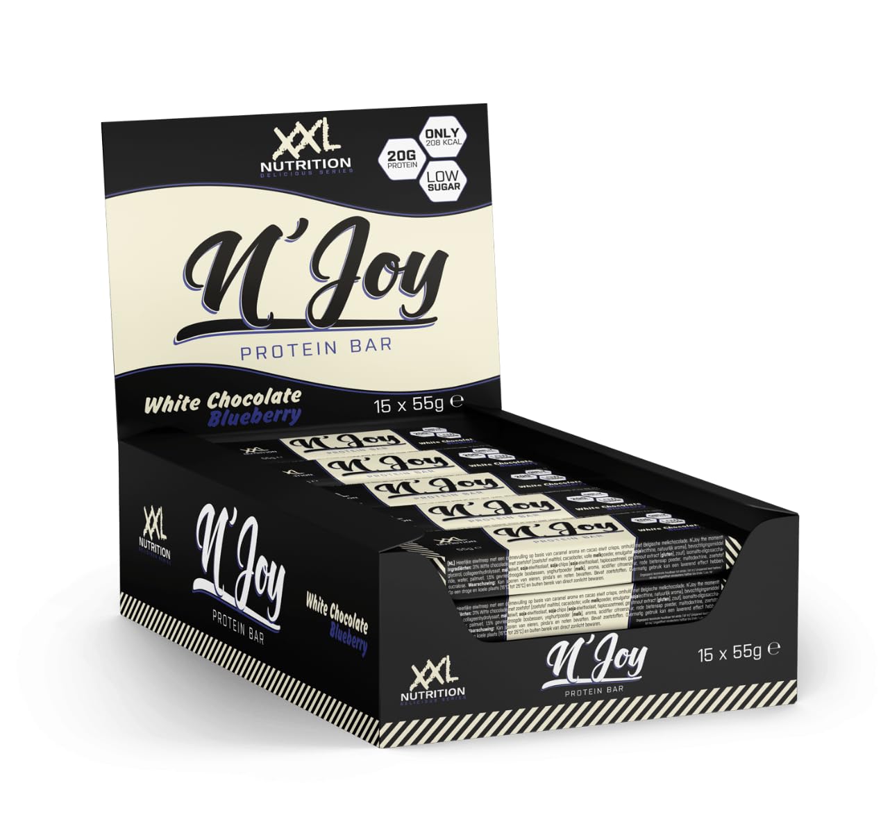 XXL Nutrition - N'Joy Protein Bar - Barre Protéinée, 20g de Protéines - Bleuet en chocolat blanc - 15 Pièces
