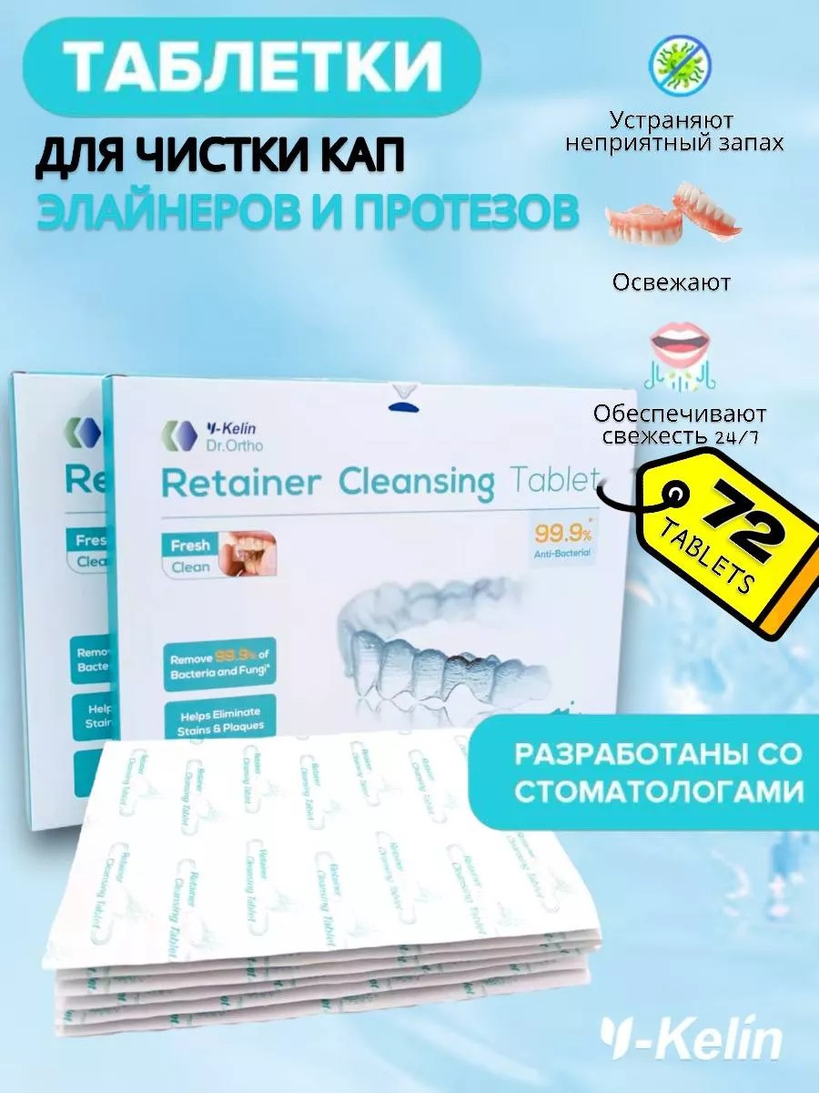 Красивые и здоровые зубы - то, к чему вы стремитесь, применяя ортодонтические конструкции. Ваши пластиковые пластинки, элайнеры и других вставные конструкции будут сиять. Таблетки для чистки Y-Kelin вам в этом отлично помогут ! Средство для чистки зубных протезов, действует комплексно: устраняет загрязнения и налёт, отбеливает, оказывает антибактериальный эффект, придаёт свежесть. Это ваш универсальный помощник! Очиститель не только профессионально добивается зеркального блеска и прозрачности дентал-конструкции, но и способствует профилактике, а также устранению воспаления. Таблетированная форма выпуска позволяет беспроблемно использовать его в бытовых условиях. В инструкции по применению разберутся даже малыши! Всего одна таблетка на стакан теплой воды, и активная жидкость от запаха изо рта, загрязнений зубных протезов готова. Вспомогательные инструменты - зубная паста и монопучковая зубная щётка, межзубные ершики. Производитель гарантирует сохранность скоб, сплинт- и ночных (для сна, от храпа), спортивных (боксерских) кап, благодаря использованию уникальной технологии Clear Мягкая формула. Никаких абразивов и агрессивных веществ в составе! Только лучшие ингредиенты: натрия пероксимоносульфат, натрия перкарбонат, масло мяты перечной, натрия лаурил сульфат, индиго, натрия бензоат, лимонная кислота и др. Ежедневное применение шипучих таблеток гарантирует глубокую очистку протезов. Шипучие таблетки для зубов подходят также для очищения всех видов ортодонтических аппаратов (кап, ретейнеров и т.п.).