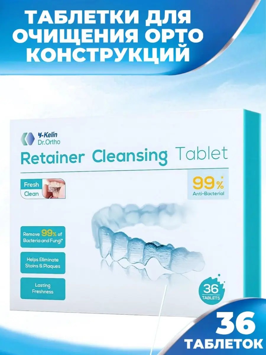Таблетки для очищения съемных зубных протезов, кап, ретейнеров Y-Kelin Retainer Cleansing Tablet, 36 таблеток.