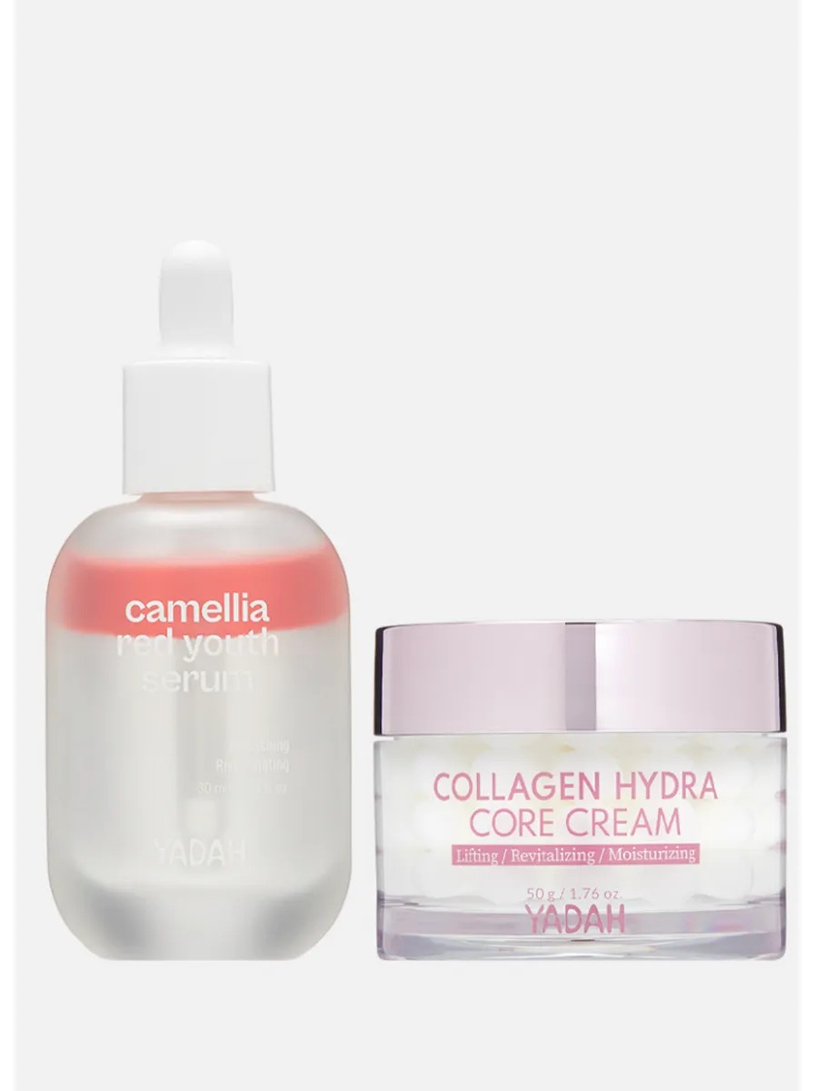 В набор входят 2 продукта YADAH для питательного и антивозрастного ухода за кожей лица: увлажняющий крем для лица с лифтинг-эффектом COLLAGEN HYDRA CORE CREAM (50 г) и питательная сыворотка для лица CAMELLIA RED YOUTH SERUM (30 мл). Двухфазная сыворотка с натуральными маслами, в том числе маслом камелии, питает кожу, делая её более упругой и сияющей. Крем с гидролизованным коллагеном и гиалуроновой кислотой увлажняет кожу и повышает её эластичность, обеспечивая лифтинг-эффект.