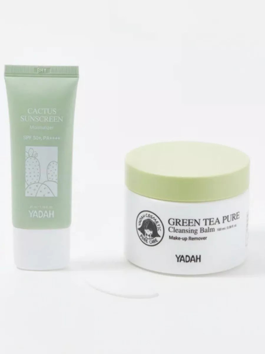 В набор входят: очищающий бальзам с зелёным чаем GREEN TEA PURE Cleansing Balm (100 мл) и увлажняющее солнцезащитное средство с экстрактом кактуса в мини-формате CACTUS SUNSCREEN SPF 50+ PA ++++ (35 мл).