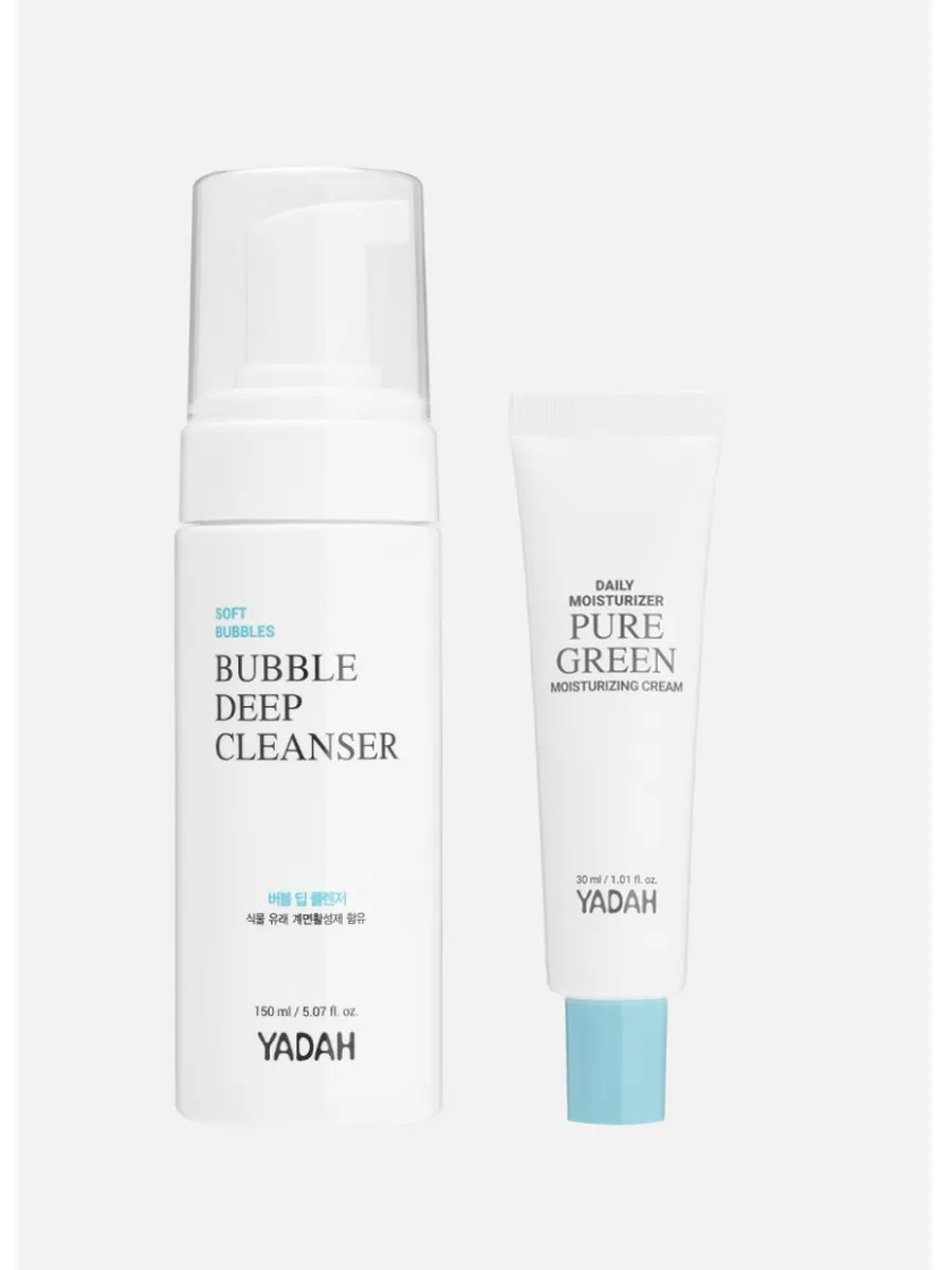 В набор входят 2 продукта YADAH для ежедневного базового ухода за кожей лица: увлажняющая пенка для умывания Bubble Deep Cleanser (150 мл) и увлажняющий крем для лица Pure Green Cream Moisturizing (30 мл). Нежная пенка бережно очищает кожу лица и удаляет загрязнения, не вызывая сухости и ощущения стянутости. Крем для лица интенсивно питает, успокаивает кожу и дарит оптимальное увлажнение.