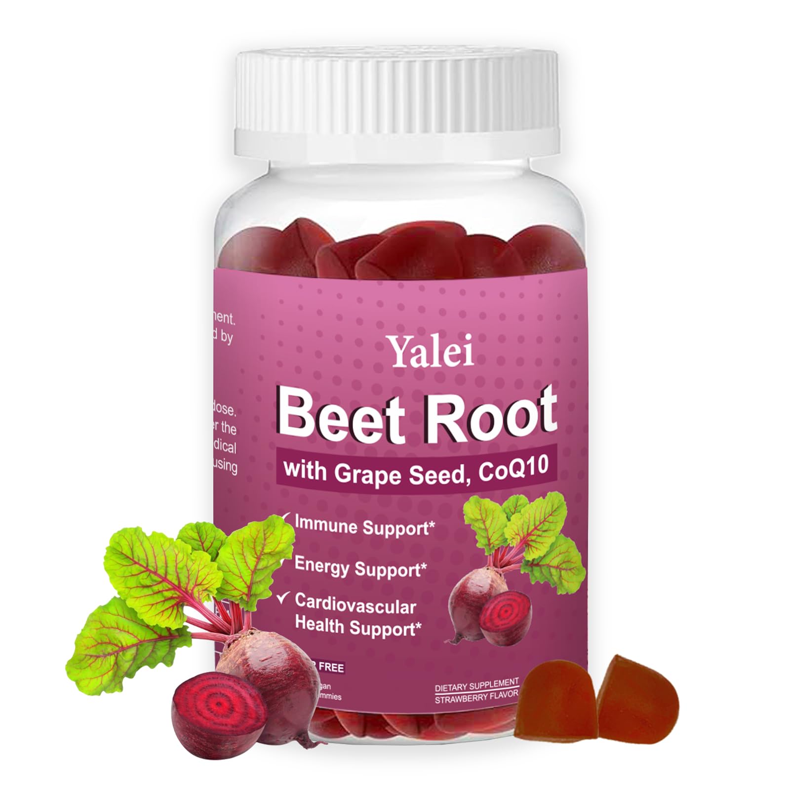 Transparency and Trust, Your Peace of Mind :You should know exactly what you're putting into your body. We take pride in our transparent, effective formulas. Our gummies are manufactured in a GMP-compliant facility, ensuring the highest standards of quality and consistency. Join thousands of satisfied customers who've chosen a smarter, tastier path to wellness. Click "Add to Cart" now and experience the real difference a premium, honest supplement can make!. You'll Love These Delicious Treats :Who says supporting your health can't be fun? Our soft, chewy gummies burst with natural strawberry flavor, making your daily routine something to look forward to. We're committed to your wellness: they're sugar-free, vegan, non-GMO, and gluten-free, made with pectin instead of gelatin. Enjoy a truly enjoyable and convenient health supplement—guilt-free. Experience High-Potency Coenzyme Q10 :Age and stress can deplete your body's natural levels of Coenzyme Q10. Don't just supplement—each serving contains 200mg of CoQ10, a highly potent dose. Known as the "spark plug" of cells, CoQ10 is essential for generating cellular energy and combating oxidative stress. This ensures your body's fundamental energy needs are supported, empowering you to tackle your day with renewed vitality. Naturally Enhance Your Heart and Vascular Health :Your body deserves the best defense. Our unique blend of 1000mg beetroot and 1000mg grape seed extract forms your daily shield for cardiovascular wellness. Beetroot is renowned for supporting healthy nitric oxide levels and promoting smooth blood flow, while the proanthocyanidins in grape seed extract deliver powerful antioxidant protection for your vascular tissues. Reward your heart with every delicious gummy. Unleash Your Inner Vitality with Our Powerful Triple-Action Beet Blend : Our premium, high-potency formula goes beyond ordinary supplements. Each serving contains 1000mg of pure beetroot powder, 1000mg of grape seed extract, and 200mg of CoQ10. This powerful trio works in harmony to naturally support your body's energy at the cellular level, helping you feel energized and vibrant throughout the day—without any caffeine or stimulants. Strawberry flavor, Non-GMO, 100 Vegan, Sugar Free.